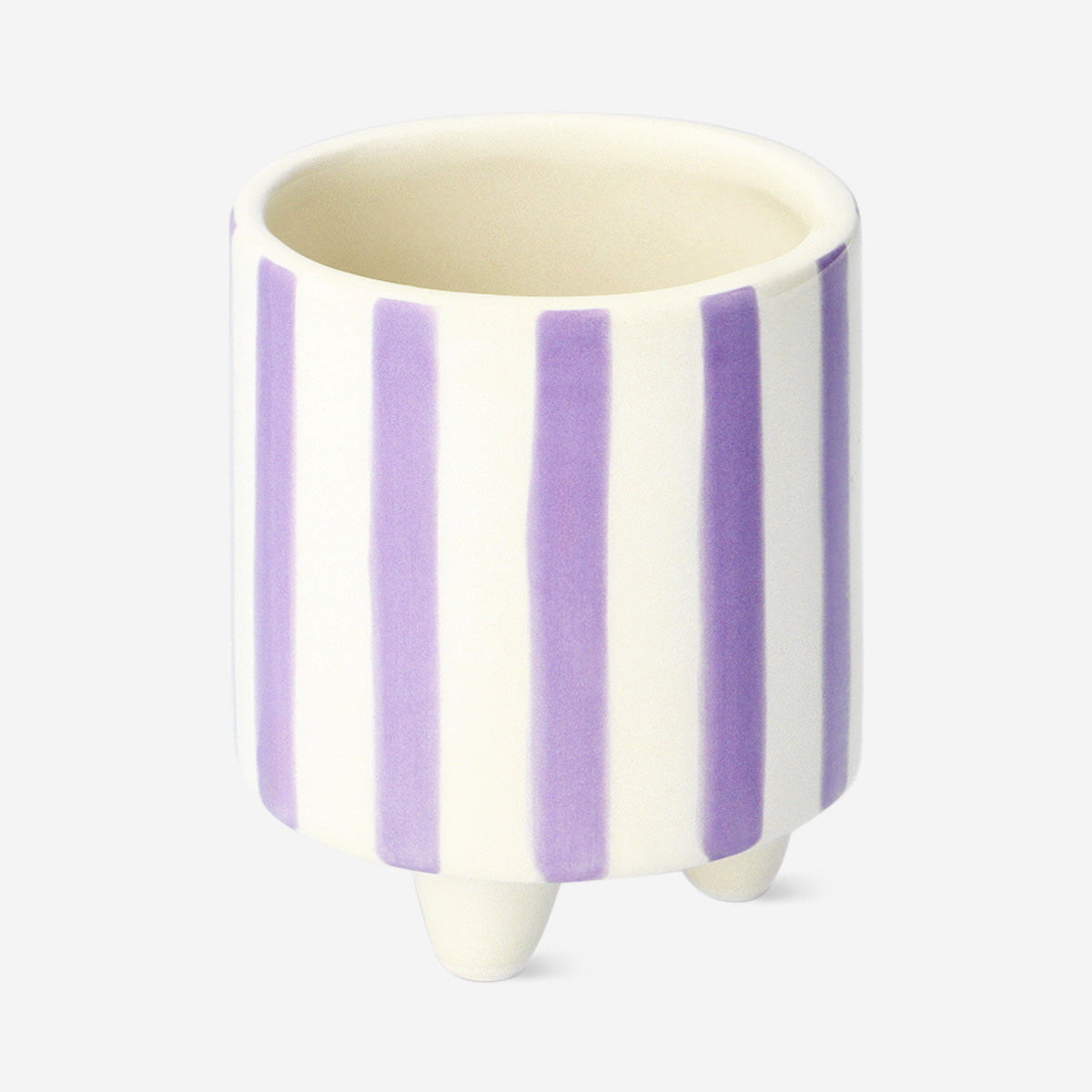 Mor Beyaz Çizgili Küçük Saksı bitki veya çiçekleri sergilemek için tasarlanmış dekoratif bir seramik parçadır ve günlük iç mekanlara yumuşak bir leylak tonu kazandırır. Yuvarlak formu küçük ayakları üzerinde hafifçe yükselerek pencere kenarları, raflar veya komodinlerde zarif bir duruş sergiler. Mor tonlu çizgili tasarımı sayesinde hem modern hem de rahat dekorasyon stilleriyle uyumlu, sakin ama eğlenceli bir görünüm sunar. Bulunduğu ortama hafif bir renk ve hareket katar.