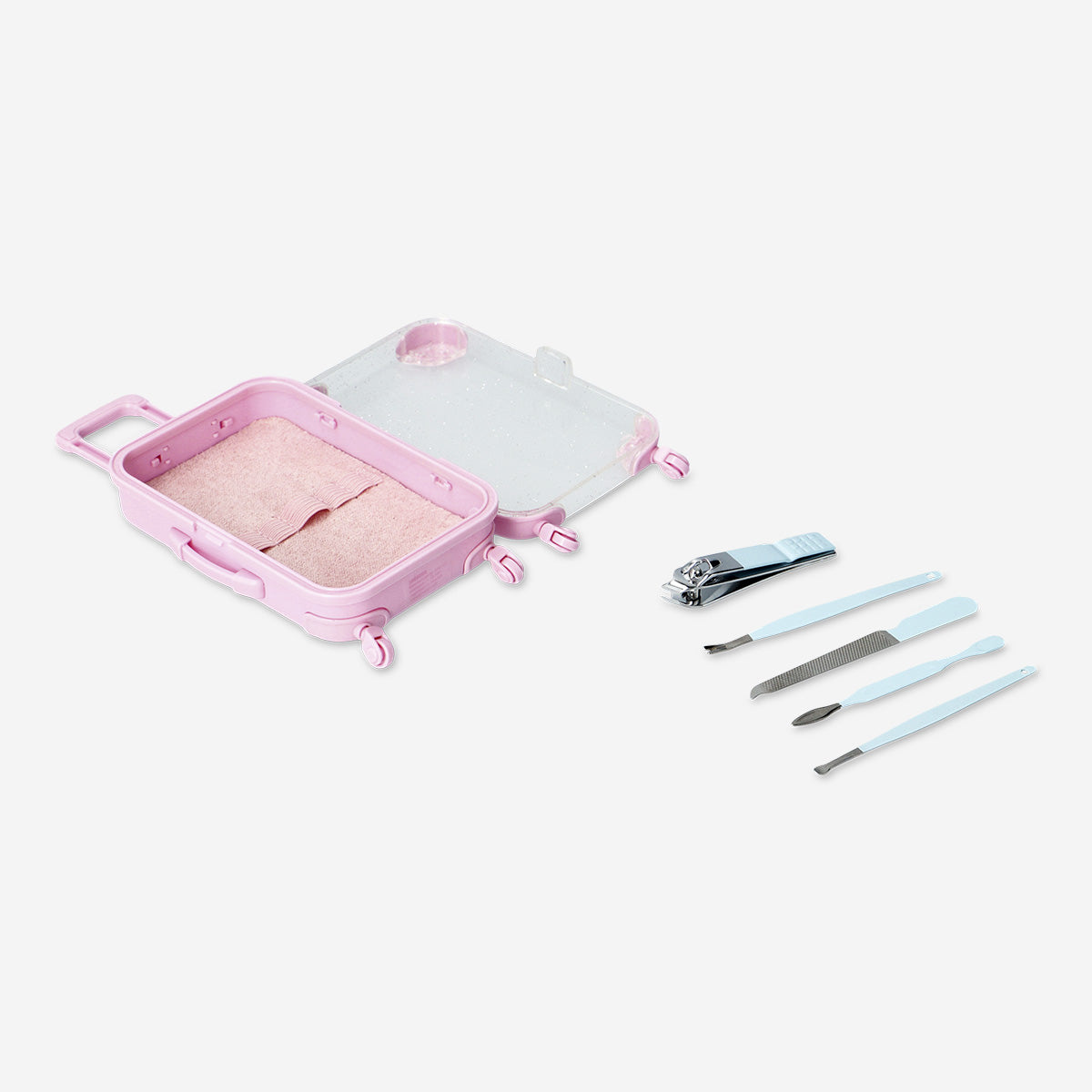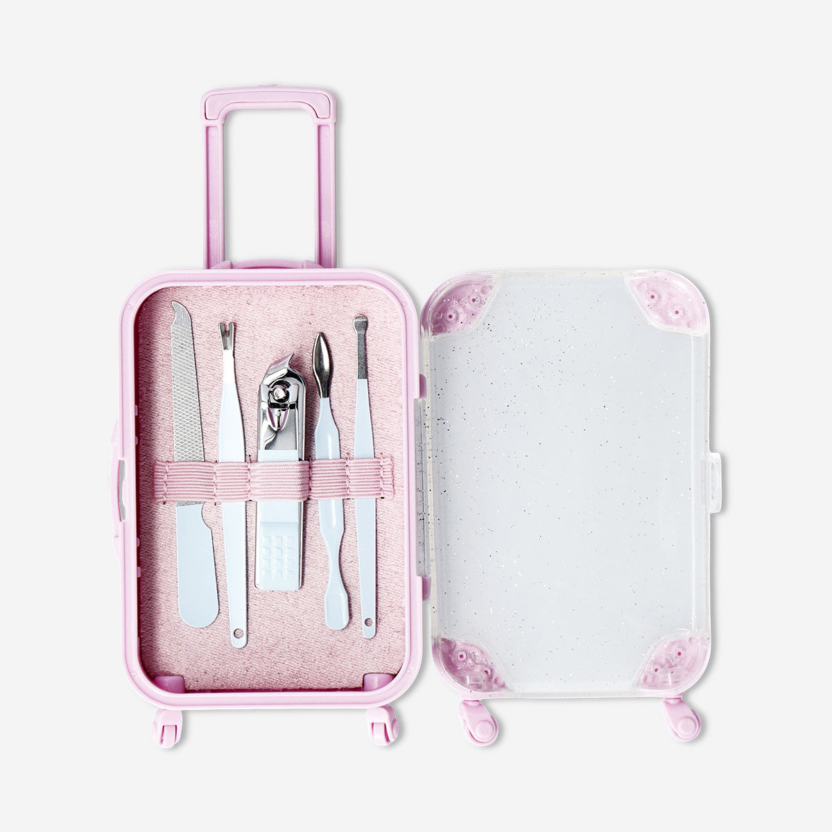Valiz Kutuda Mini Manikür Seti, tırnak bakım rutininize neşeli, sevimli ve eğlenceli bir dokunuş katan pratik bir çözüm sunar. Parlak pembe mini valiz biçimindeki çantası, hem düzenli bir görünüm sağlar hem de seti taşıması keyifli bir aksesuar haline getirir. İçerisinde tırnak kesme, törpüleme ve detay temizliği için gerekli 5 adet temel alet bulunur; böylece hem el hem ayak bakımını kolayca yapabilirsiniz. Günlük bakımınızı daha düzenli hâle getirirken aynı zamanda tatlı bir stil katar.