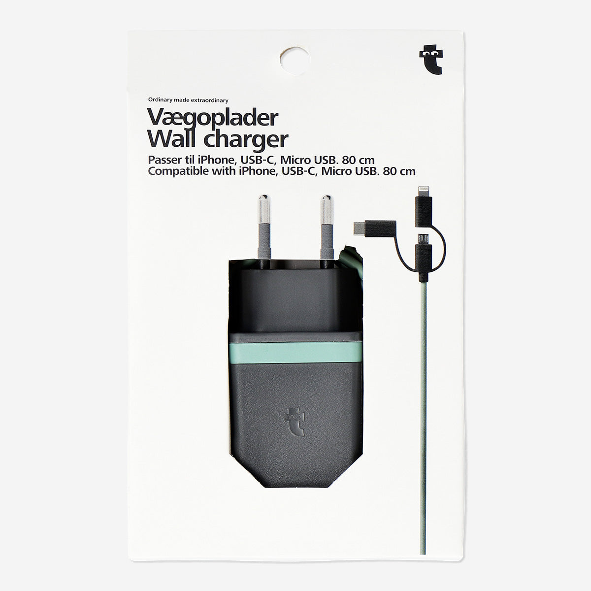 Tüm cihazlarınızı bu çok yönlü 3’ü 1 arada duvar şarj cihazı ile şarj edin. 8,4 x 3,8 x 2,7 cm ölçülerindeki ürün, yeşil detaylı gri renkte tasarlanmıştır. iPhone, USB-C ve Micro USB ile uyumludur. 80 cm kablosu sayesinde kullanım kolaylığı ve esneklik sunar. Evde ya da seyahatte kullanım için ideal olan bu şarj cihazı, nerede olursanız olun cihazlarınızın şarjının bitmemesini sağlar.