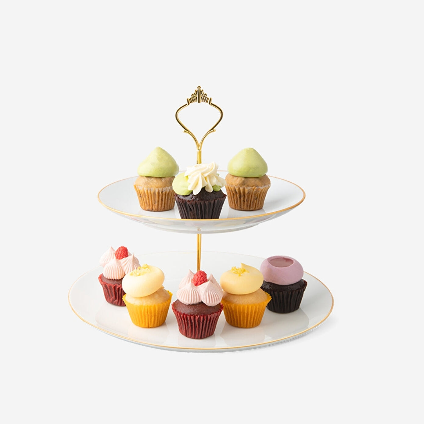 Gold Detaylı 2 Katlı Servislik, altın rengi detaylarıyla sofranıza zarif bir dokunuş katar. Bu şık sunumluk, 2 katlı yapısı sayesinde kurabiyeler, çikolatalar ve diğer ikramlıkları düzenli bir şekilde sergileyerek sofranızın dekorasyonunu tamamlar. Hem pratik hem de estetik olan bu servislik, misafirlerinize şıklığı ve zarafeti bir arada sunmanızı sağlar.