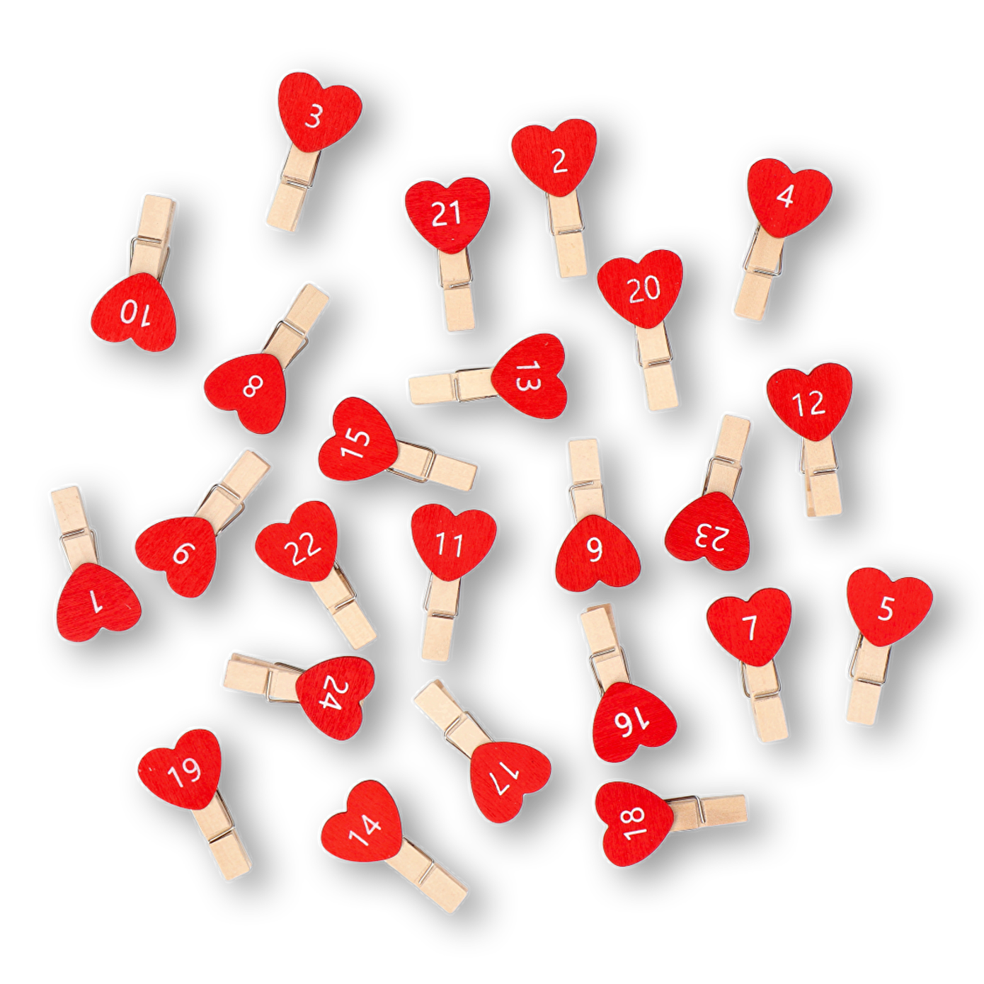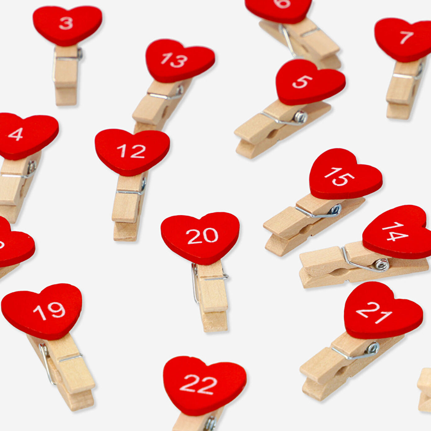 Bu ahşap mandallarla tatil süslemelerinize sevimli bir dokunuş katın, üzerlerinde kırmızı kalpler ve rakamlar bulunur. Her biri 3.9 x 1.2 x 2.1 cm ölçülerindedir ve bu set 24 parçadan oluşur, bu da bir advent takvimi oluşturmak veya Noel hediye paketlemelerinize kişisel bir dokunuş katmak için mükemmeldir. Canlı kırmızı kalpler ve net bir şekilde basılmış rakamlar, bu mandalları Noel'e geri sayım yapmak veya festivale uygun el işi projeleri için ideal kılar. Hediye etiketlerini tutturmak, süslemeleri asmak veya tatil kartlarını sabitlemek için kullanabilirsiniz. Bu şirin ve çok yönlü mandallarla Noel kutlamalarınızı zenginleştirin.