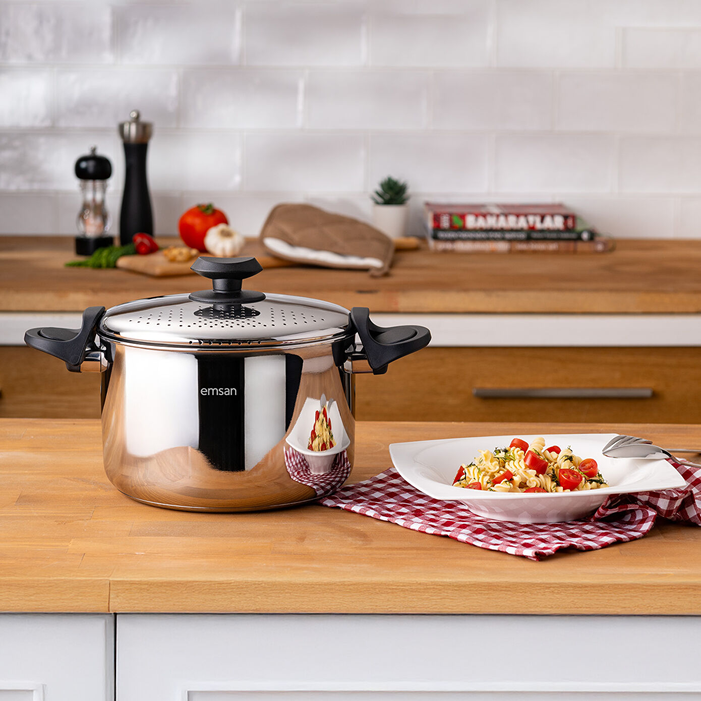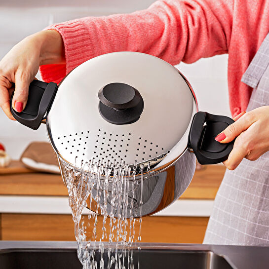 - Kilitli ve süzgeçli kapağı sayesinde süzme işlemini tek hamlede gerçekleştirir.