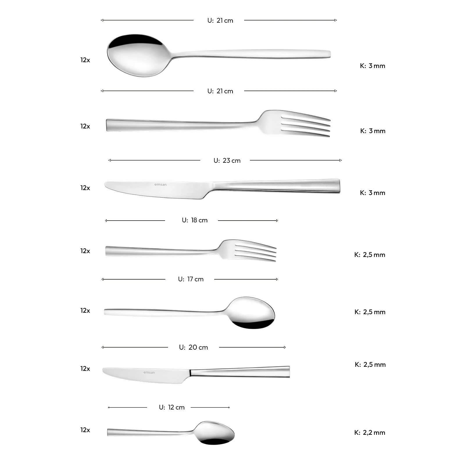 - 12 Adet Yemek Kaşığı (21 cm – 3 mm)