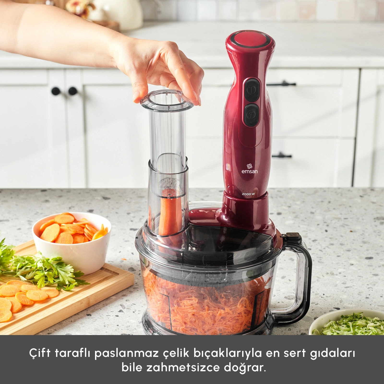 - 2000W yenilenmiş yüksek performanslı güçlü motoru sayesinde saniyeler içerisinde doğrama, çırpma ve parçalama işlemlerini gerçekleştirir.