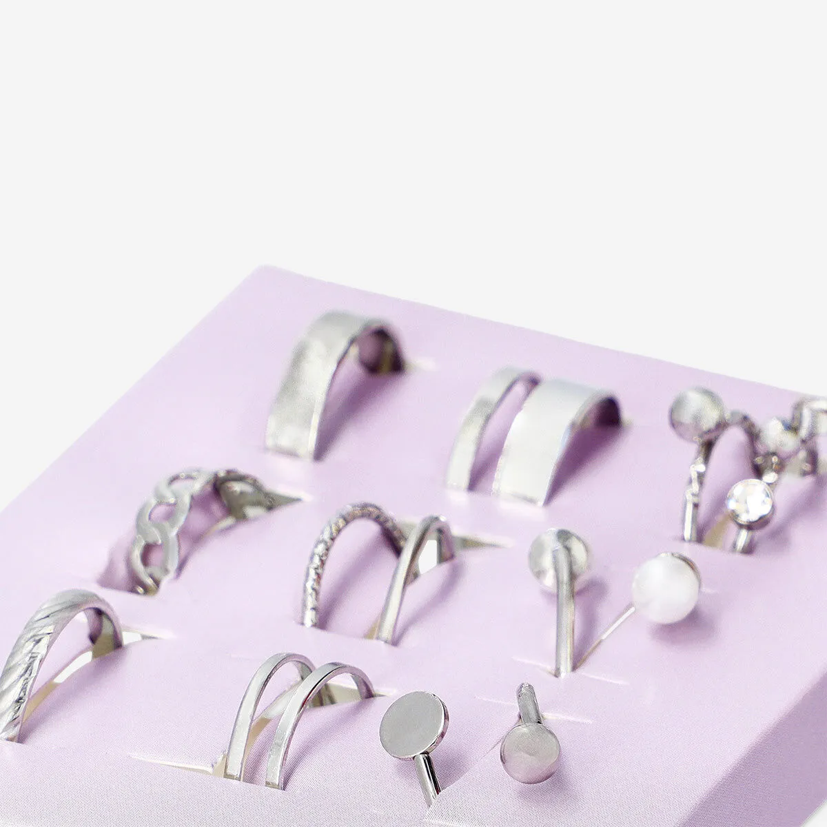 9'lu Ayarlanabilir Gümüş İnci Detaylı Yüzük Seti, stilinizi zarif bir şekilde tamamlamak için mükemmel bir tercihtir. Metalden üretilen her yüzük yaklaşık 2,2 x 0,5 cm boyutlarındadır ve inci vurguları, dokulu bantlar ve benzersiz motifler gibi çeşitli tasarımlara sahiptir. Bu yüzükler, kişisel tarzınızı yansıtarak kıyafetlerinize şıklık katacak ve her durumda kullanabileceğiniz şık bir aksesuar sunar.