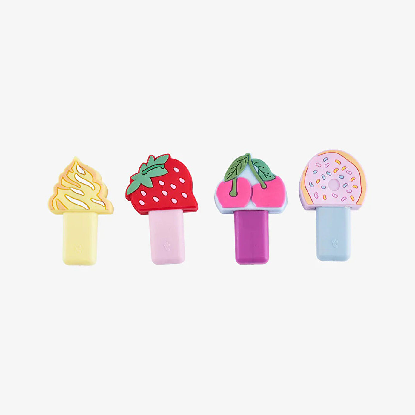 Notlarınıza eğlence katın! Meyve Şekilli Fosforlu Kalem Seti, canlı renkleri ve sevimli tasarımıyla dikkat çeker. Çilek, kiraz, donut ve dondurma şeklindeki silikon kapaklar, kalemlerinizi hem korur hem de masanıza dekoratif bir hava katar.