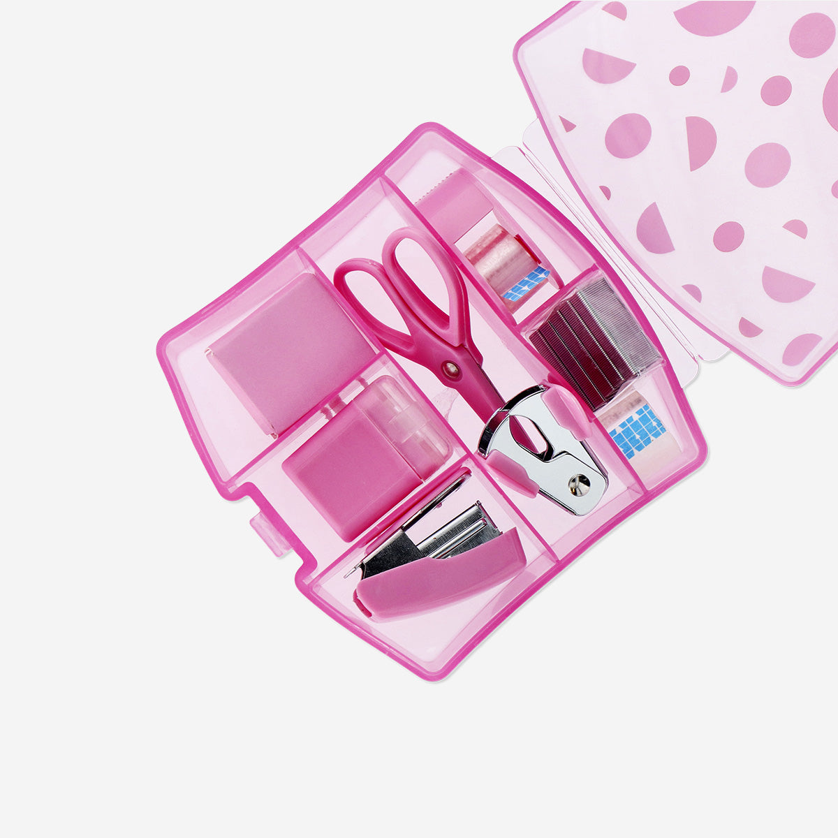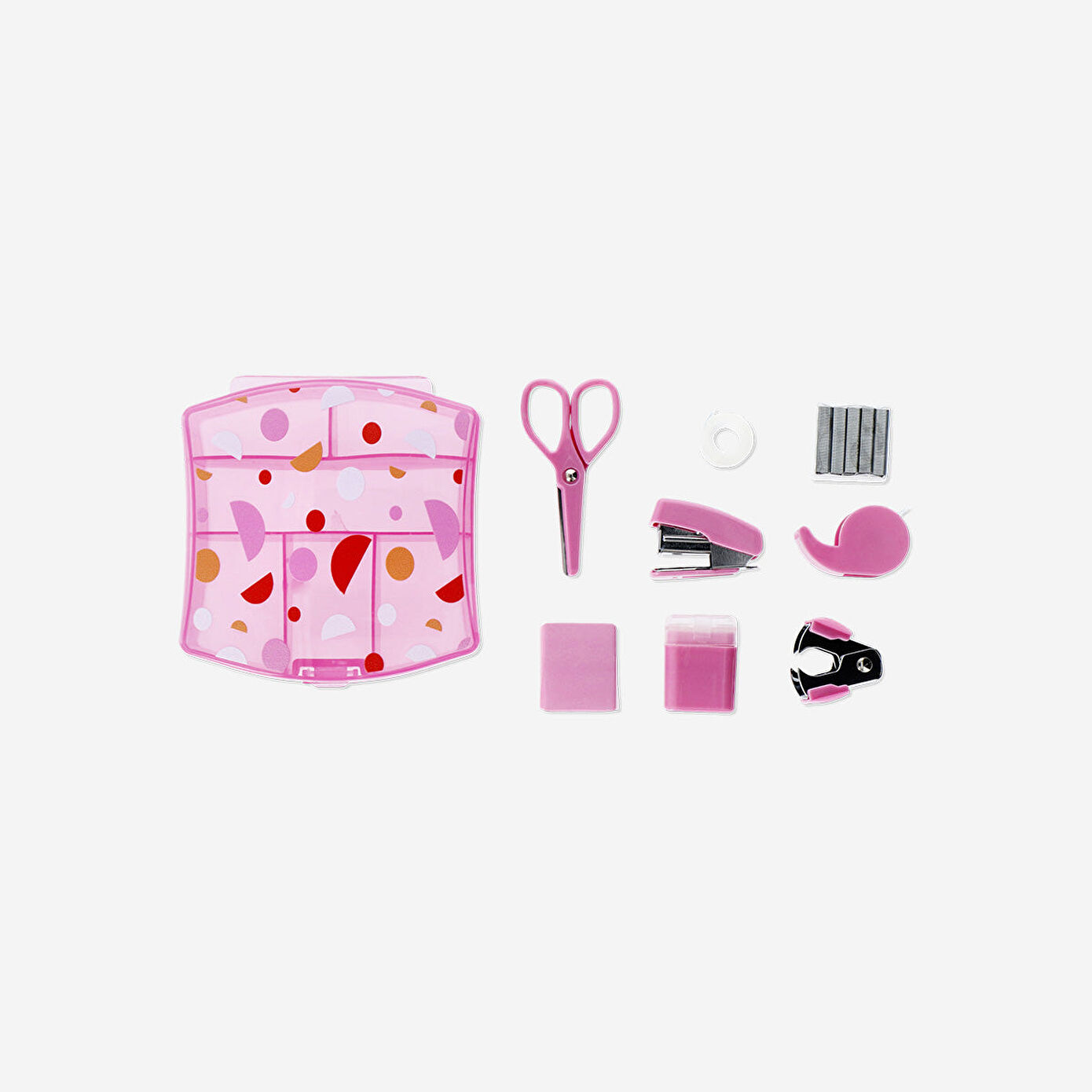 Pembe Kutulu Kırtasiye Seti, okul, ofis veya ev kullanımı için mükemmel bir düzenleyici çözüm sunar. 10,5 x 10,7 x 3 cm boyutlarındaki bu kompakt plastik set, temel ofis malzemelerini – makas, bant, zımba, yapışkan notlar ve daha fazlasını – bir arada tutarak işlerinizi kolaylaştırır. Tüm malzemeler şık ve pratik bir pembe kutuda düzenlenmiştir, böylece çalışma alanınızda veya çantanızda her zaman elinizin altında olur.