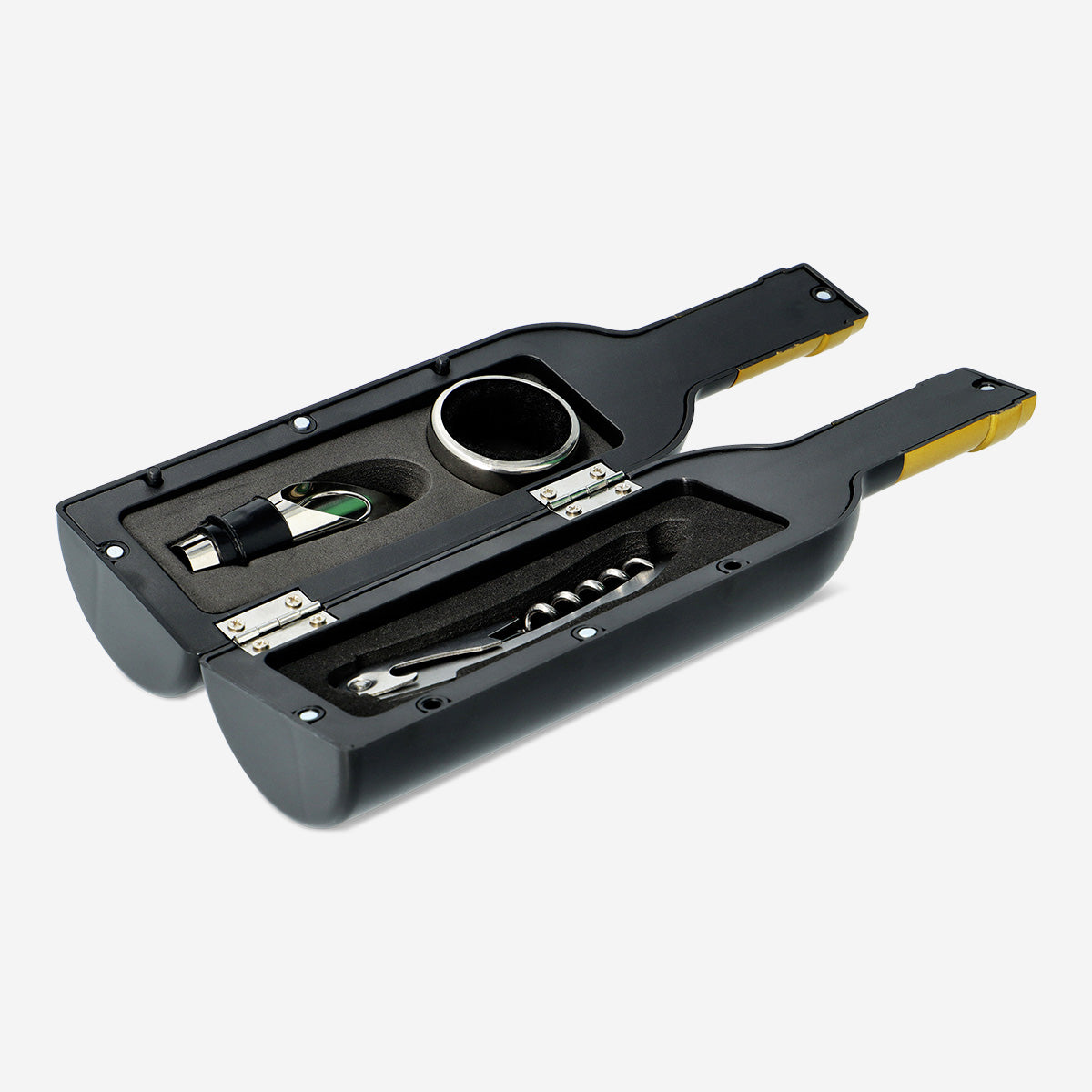 Şık tasarımıyla dikkat çeken bu Tirbüşon Seti, her şarap severin araç gereç koleksiyonuna mükemmel bir katkı sağlar. Lüks altın renkli kapağa sahip siyah şişe formundaki özel kutusunda sunulan set; paslanmaz çelik bir açacak, metal ve silikon karışımı bir dökücü ve bir şarap halkasından oluşur. 6,3 x 23,5 cm ölçülerindeki bu set, hem kullanışlı hem de estetik yapısıyla şarap deneyiminizi üst seviyeye taşır.