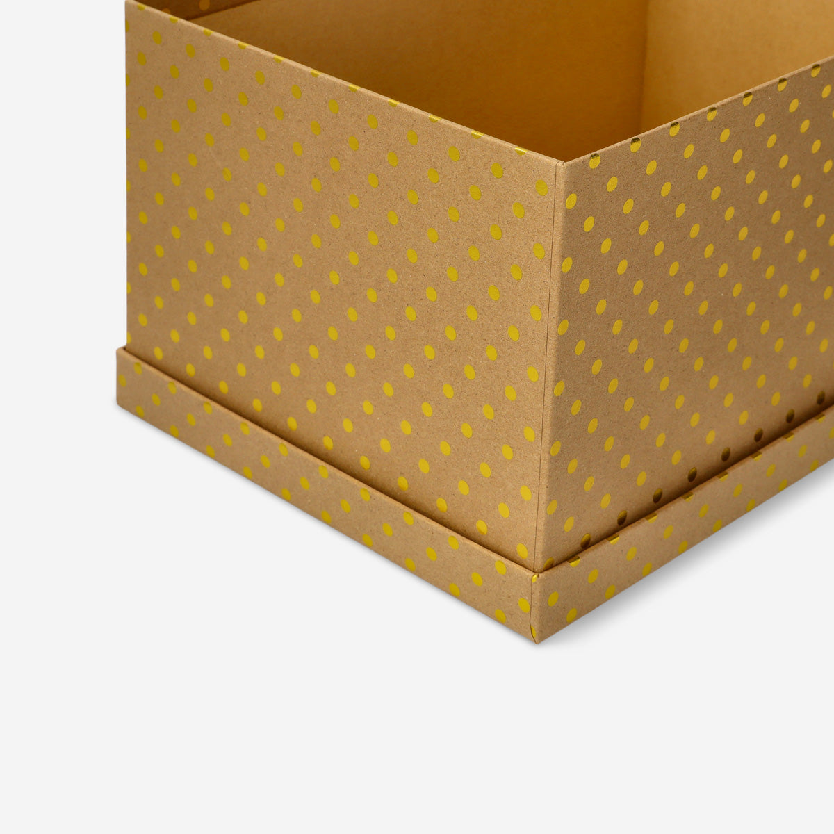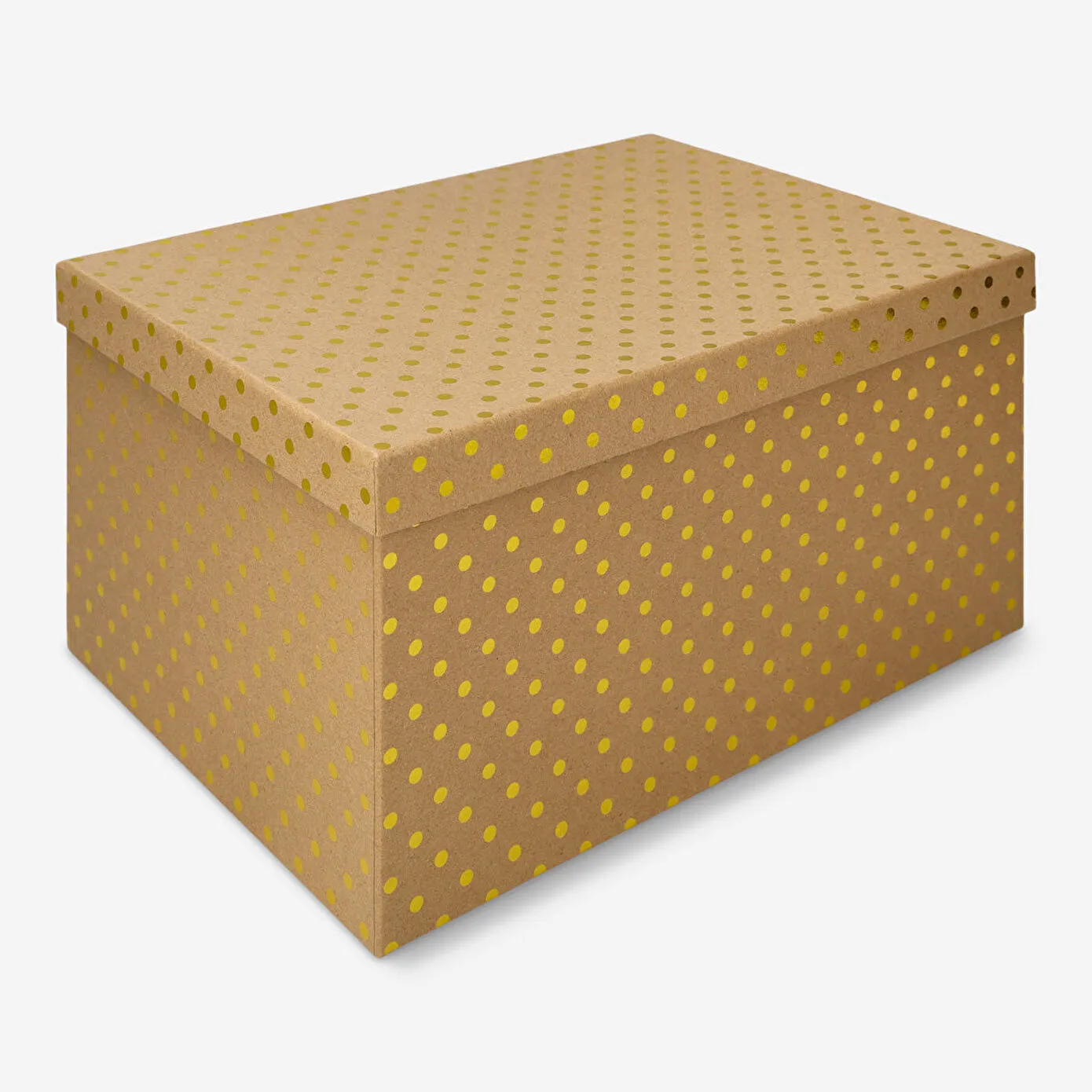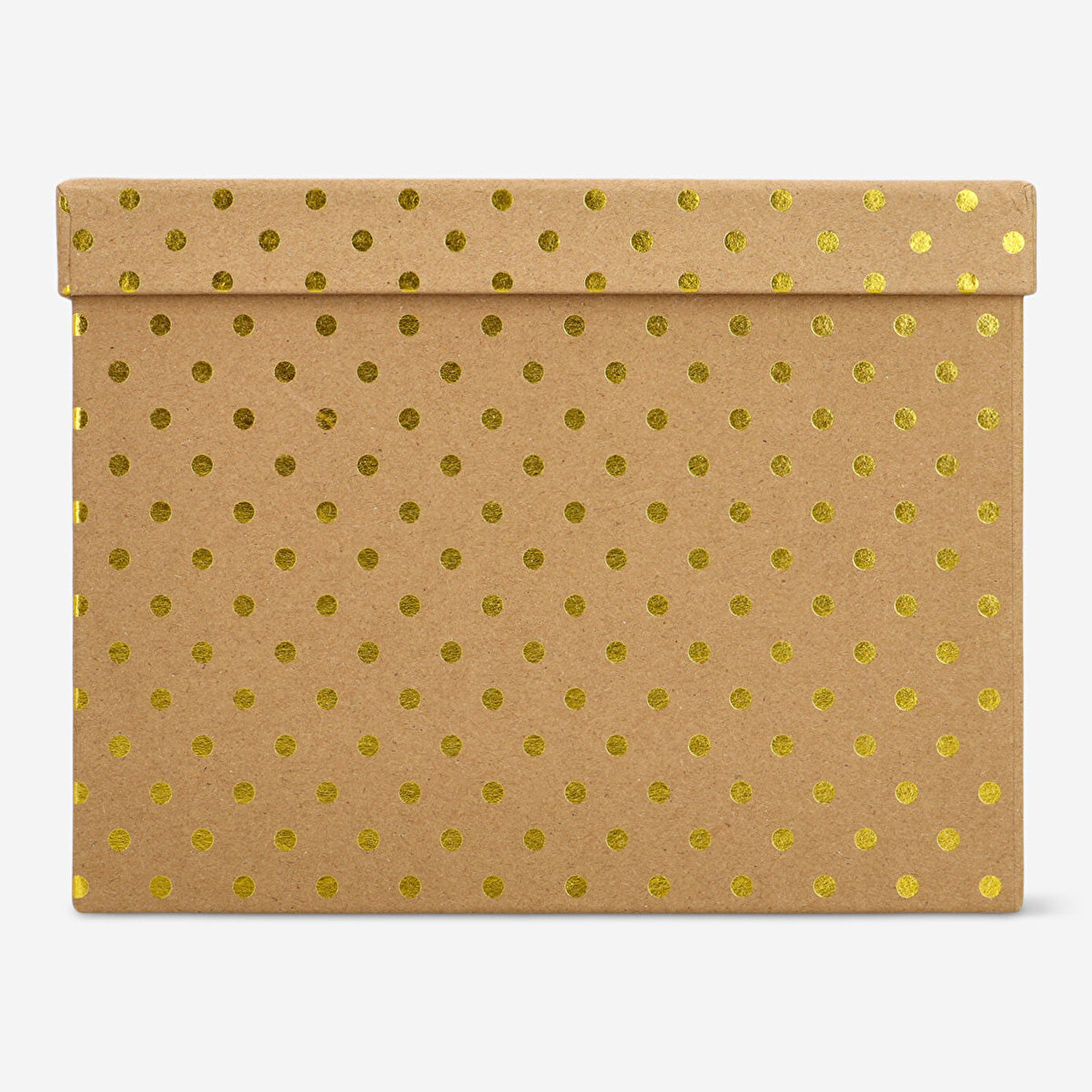 Yılbaşı sezonu için mükemmel olan bu büyük Gold Puantiyeli Hediye Kutusu, altın folyo noktalarıyla süslenerek hediyelerinize zarif bir dokunuş katar. 28 x 15 x 20 cm ölçülerindeki bu kutu, kağıttan yapılmış olup, giysi, oyuncak ve yılbaşı tatlıları gibi çeşitli hediyeleri paketlemek için idealdir. Kraft kağıdı üzerindeki şirin altın noktalar, kutuya yılbaşı havası katarken, bu hediye kutusunu yılbaşı hediyeleri için mükemmel bir seçenek haline getirir.