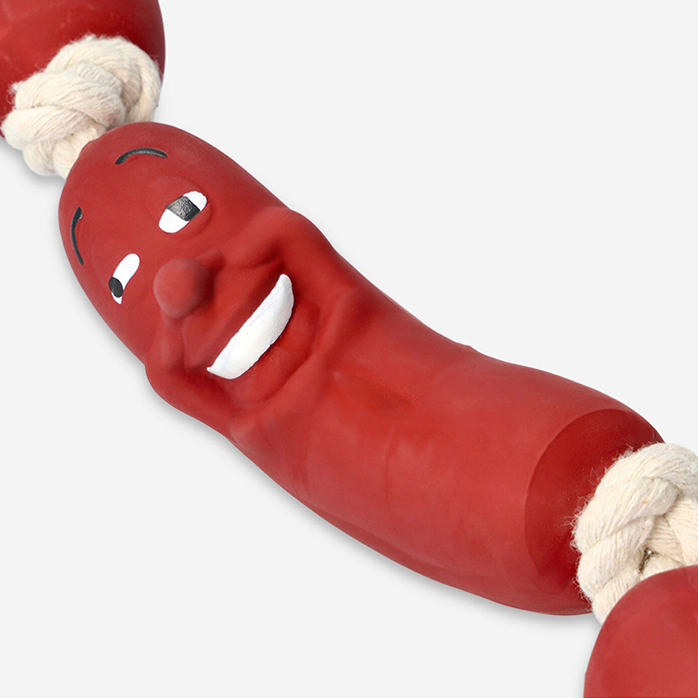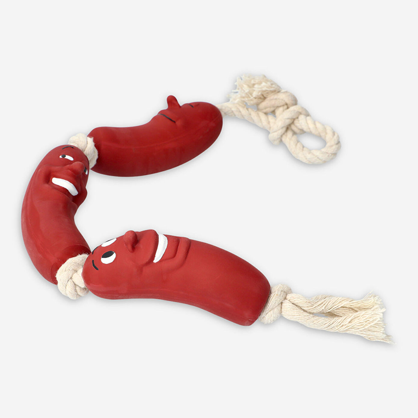 Sosis Şeklinde Köpek Oyuncağı, tüylü dostunuza saatlerce sürecek eğlenceli ve enerjik oyun deneyimi sunar. Üç sosisin bir ip üzerinde birleştirilmesiyle tasarlanan bu eğlenceli oyuncak, 55 x 3 x 3 cm boyutlarında olup köpeklerin hem çiğneme hem de çekiştirme ihtiyaçlarını karşılamak için idealdir. Dayanıklı plastik kauçuktan üretilmiş olması, interaktif oyunlarda uzun süre kullanılabilirlik sağlar.