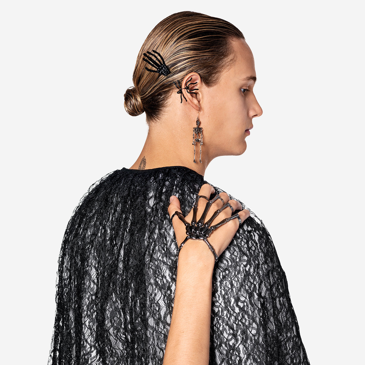 Kemik Şeklinde Metal Küpe, tarzınıza benzersiz ve ürkütücü bir dokunuş katarak Halloween ruhunu stilinize taşıyor. El iskeletini andıran tasarımıyla, kulağınızdan aşağı doğru zarifçe sarkan bu parça hem dramatik hem de dikkat çekici bir görünüm sunar. Günlük kıyafetlerinize farklı bir hava katmak için veya kostüm partilerinde çarpıcı bir detay olarak kullanmak için idealdir.