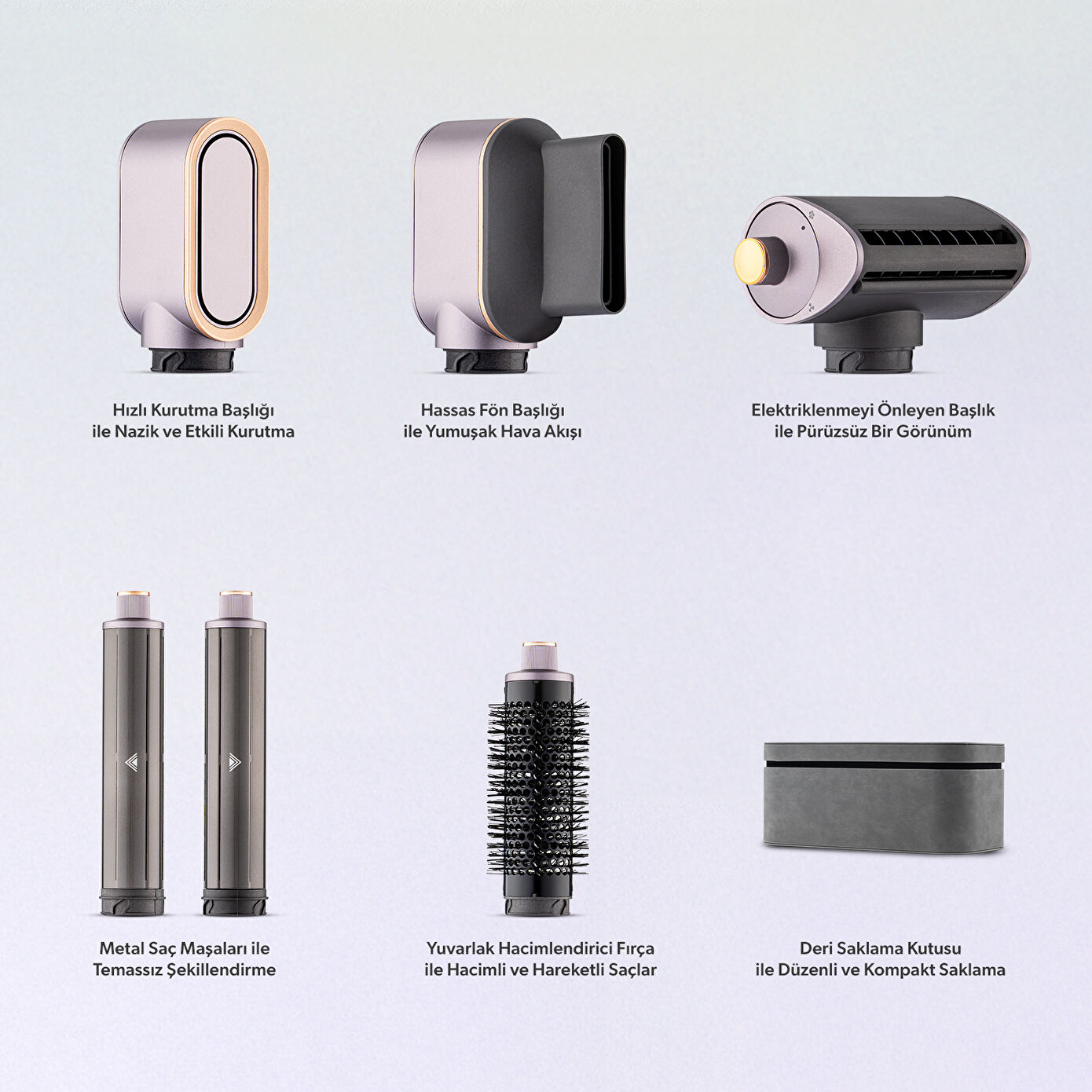 Cihaza kolayca yerleşir, saç kurutma sonrası küçük tutamlarla kullanılır. Saç uçlarından sarılarak yukarı doğru şekil verir, soğuk hava ile sabitlenir. Saça doğal, hacimli ve hareketli bir görünüm kazandırır.
