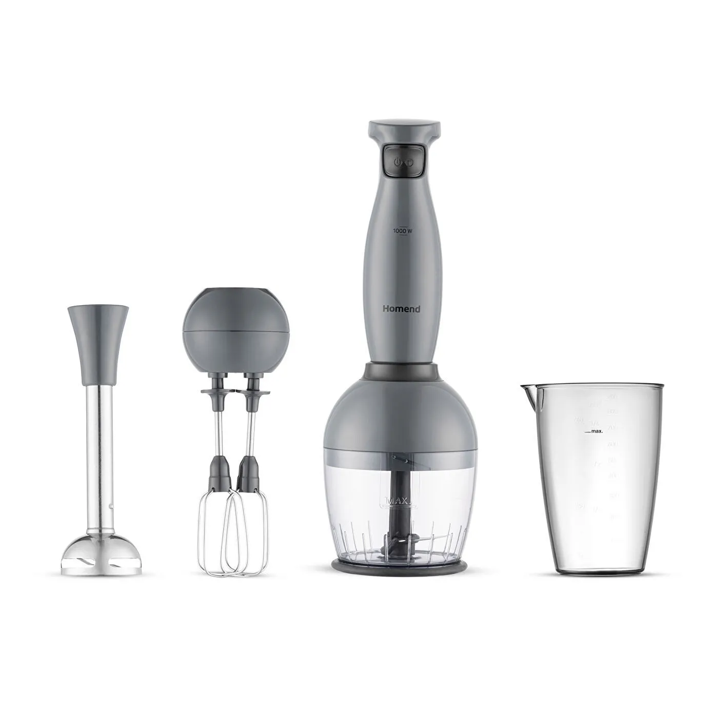 Farklı hazne ve aparat seçenekleriyle çok yönlü kullanım imkânı sunan Homend Handmaid 1967H Blender Set, 1000 Watt gücündeki motoru sayesinde çeşitli yiyecekleri zahmetsizce hazırlamanıza yardımcı olur. Kek hamuru, krema, bebek maması, mayonez, milkshake veya o an canınızın istediği her şeyi kısa sürede hazırlayabilirsiniz.