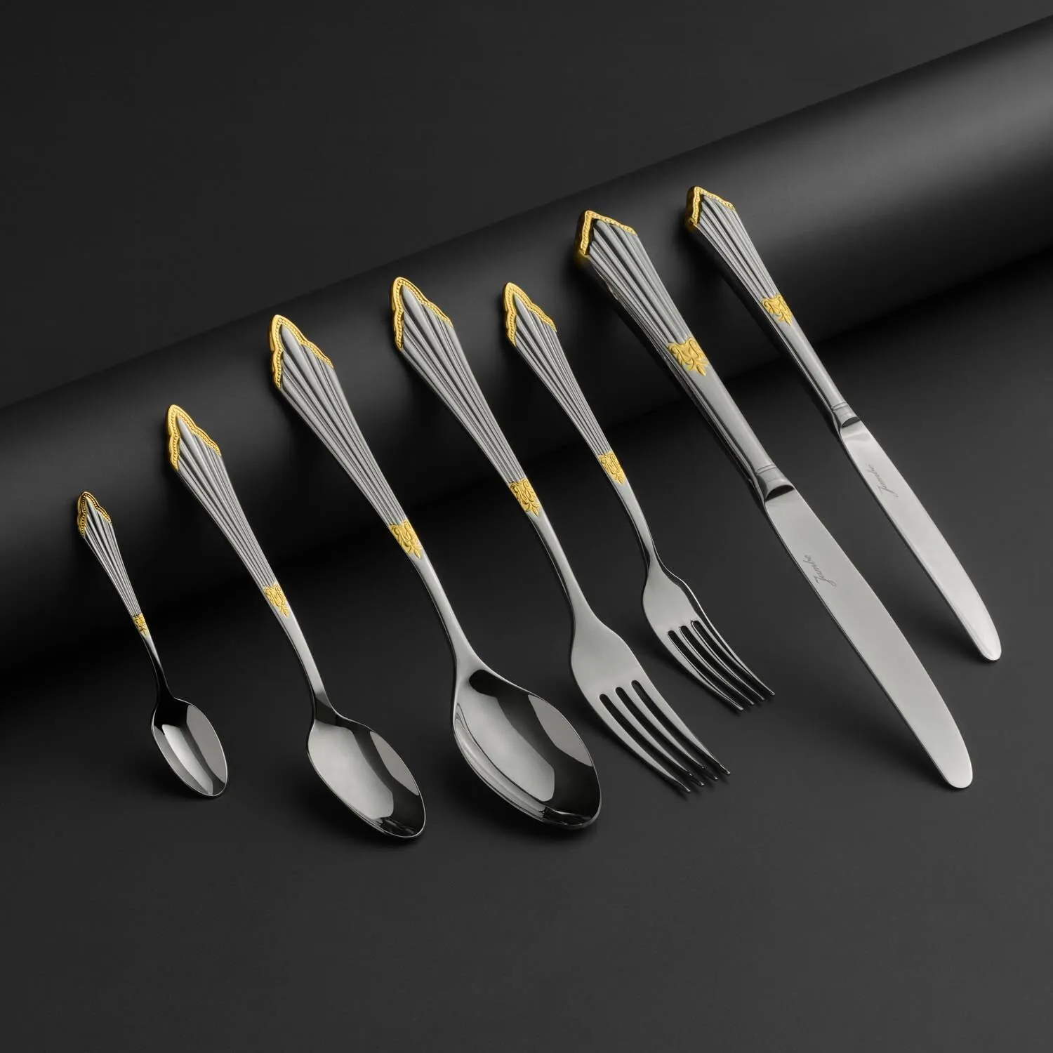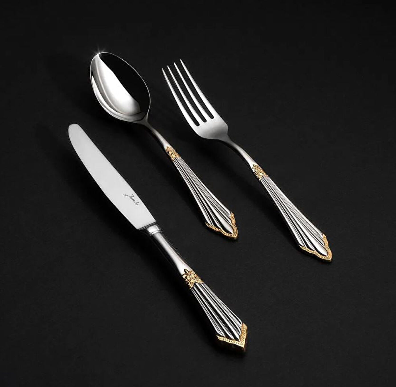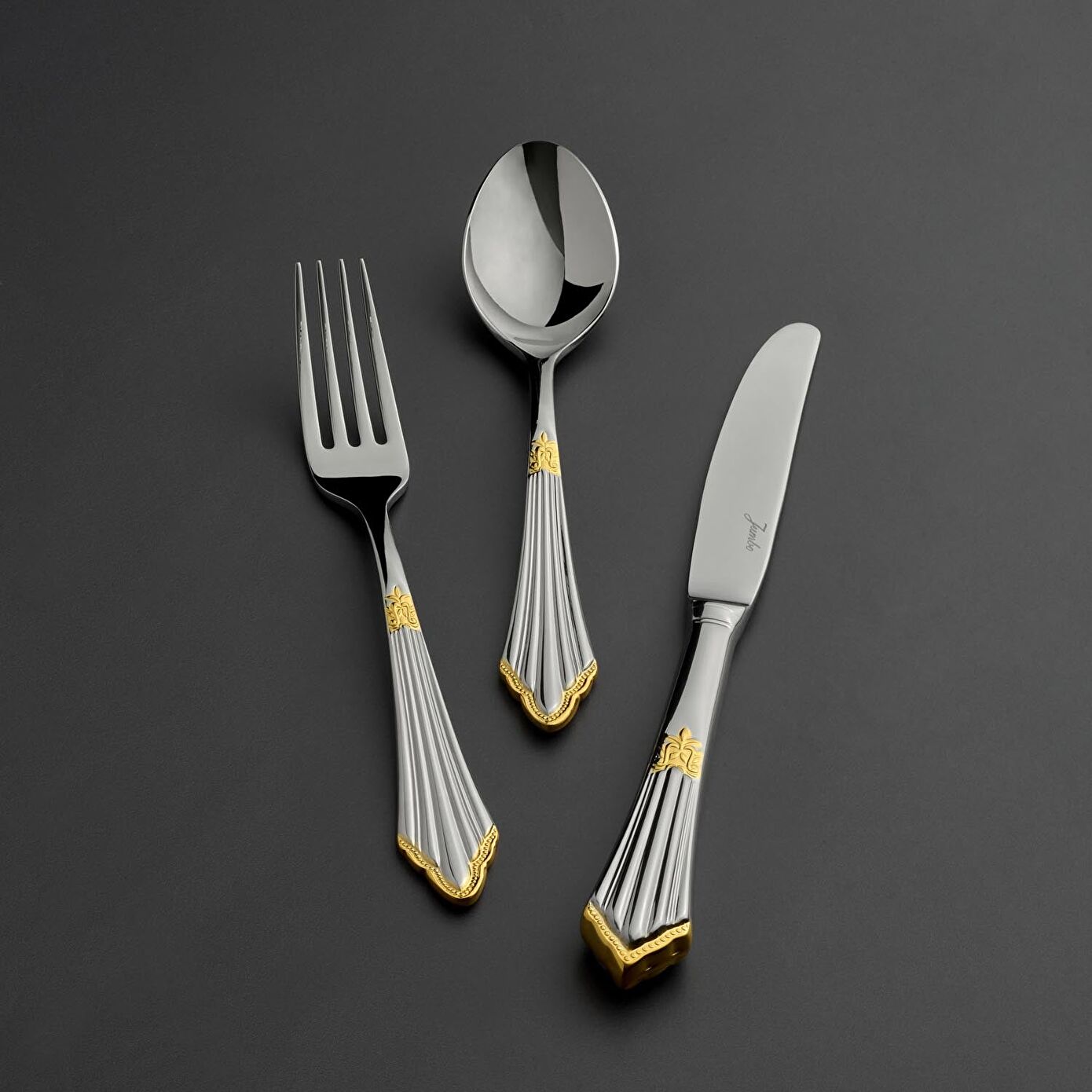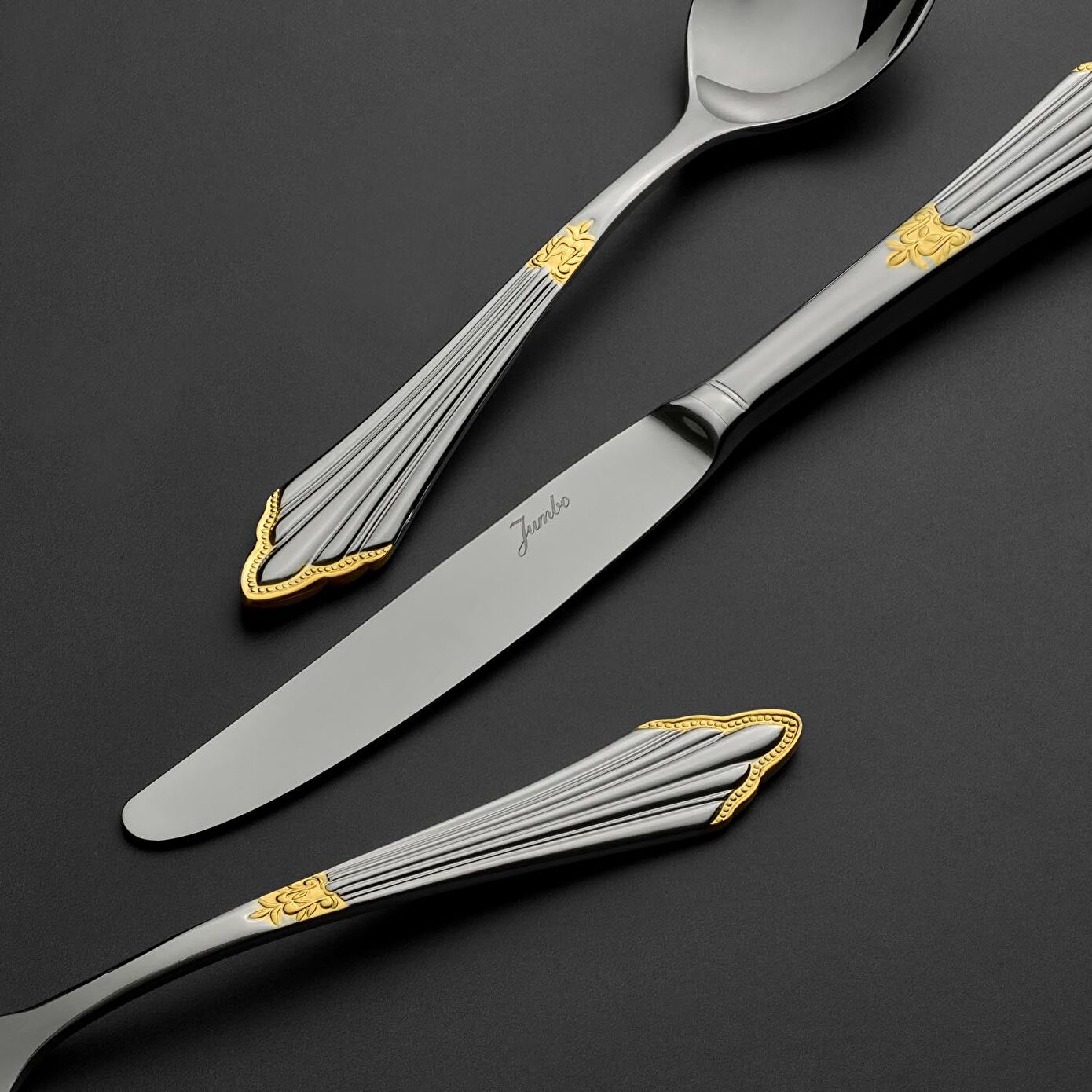 Jumbo 1003 altın çatal kaşık bıçak takımının en ayırt edici tasarım özelliklerinden biri detaylarında gold rengine sahip olması. Takımın muhtelif noktalarında görebileceğiniz gold rengi, tüm sete oldukça zarif ve klasik bir hava katıyor. Böylece sizi adeta zamanda yolculuğa çıkaracak olan bu takımlar şaşaalı ve ışıltılı yemek sunumlarınızın da favorisi olabilir. Sap bölümünde yer alan çizgiler ve hatlar da takıma oldukça karakteristik bir hava katmayı başarıyor.Ürün Özellikleri