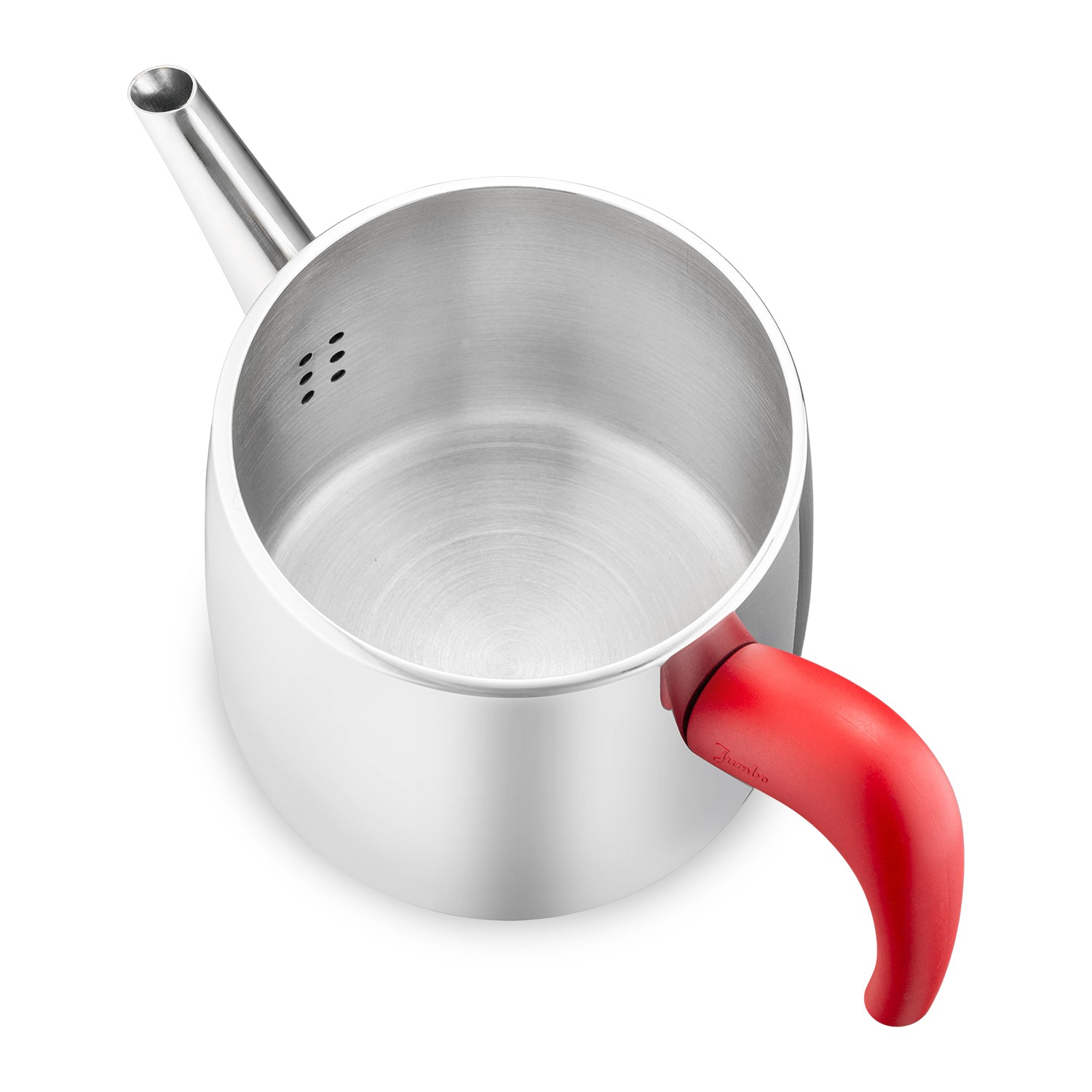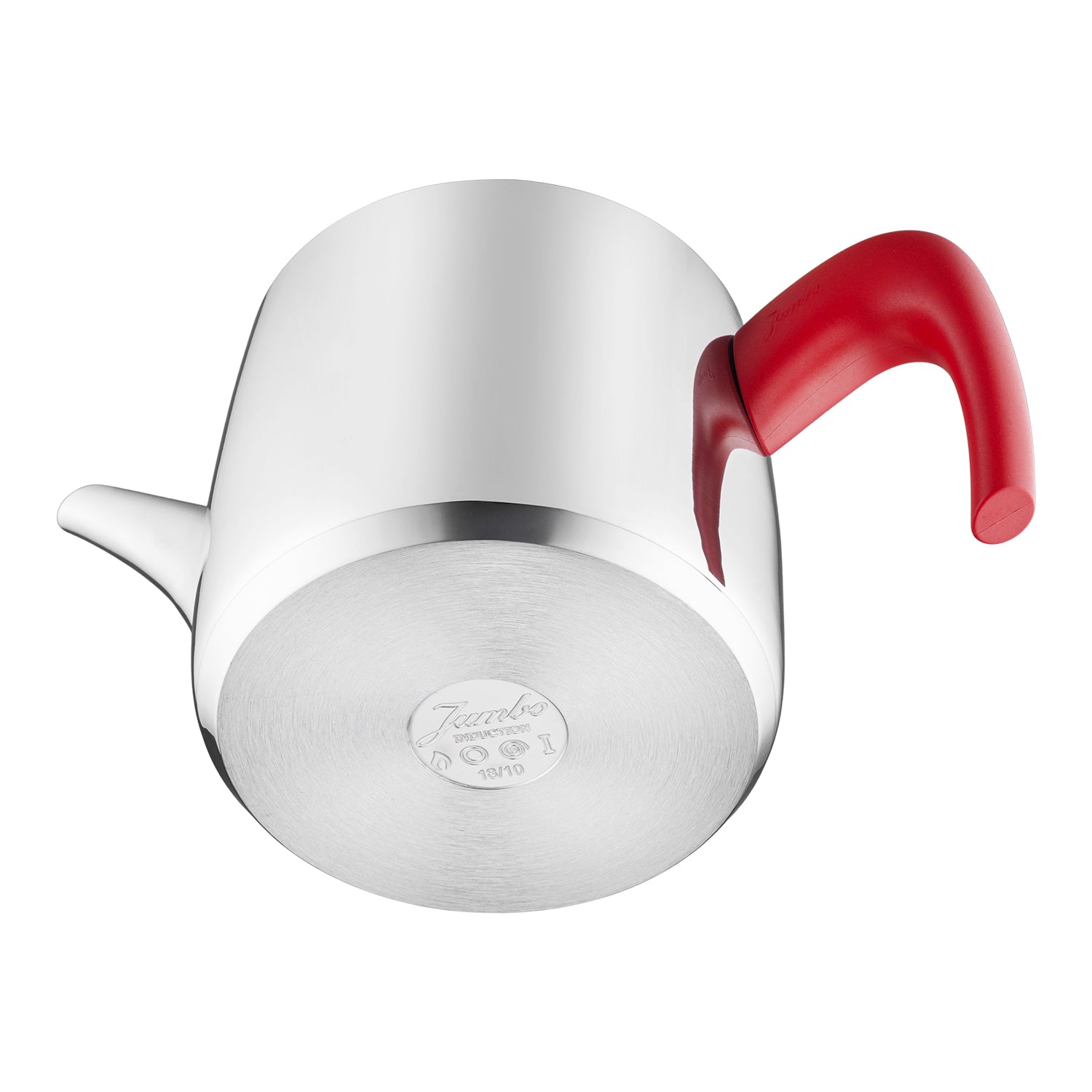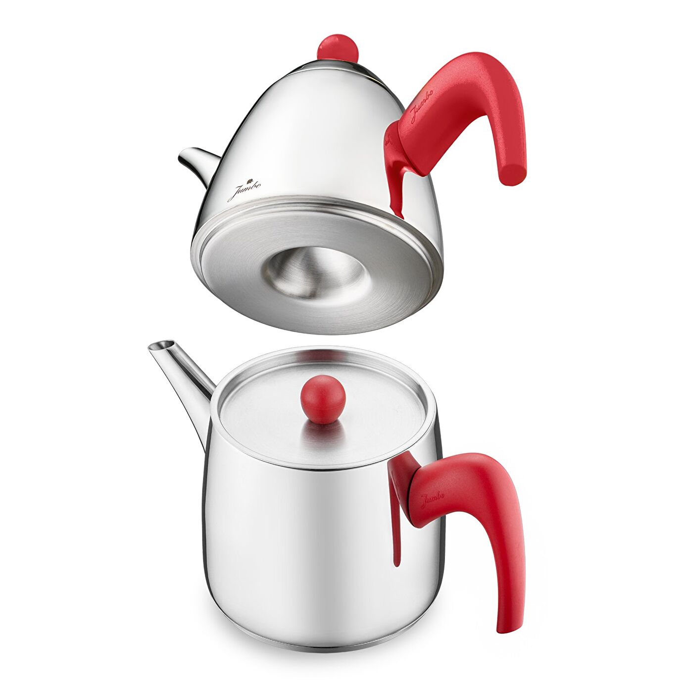 İster gazlı ister elektrikli isterseniz de indüksiyon olsun, Jumbo 6500 kırmızı çaydanlığı her çeşit ocakta kullanmanız mümkün. Zamana meydan okuyan tasarımıyla bu kırmızı saplı çaydanlık, Jumbo'nun modern çizgilerini çeliğin işlevselliğiyle birleştiriyor. Her detayıyla kullanıcı dostu olan bu ürün aynı zamanda ideal boyutuyla da beğeni toplamakta. Ürün, 304 paslanmaz çelik suluk ve demlik kısımlarına ek olarak 430 paslanmaz çelik taban kısmına sahip. Hatta çaydanlığın demlik kısmındaki süzgeç de çelikten üretilmiş. 1,05 litrelik demlik ve 2,25 litrelik suluk bölümleri bulunan bu ürünü, kalabalıklaştığınız arkadaş ziyaretlerinde rahatlıkla tercih edebilir, çaydanlığınızla 6 kişiye kadar çay servisi yapabilirsiniz. Kapsül tabanıyla çay keyfinizin vazgeçilmezi haline gelecek olan Jumbo 6500 kırmızı çaydanlık hem zamansız tasarımı hem de fonksiyonel özellikleriyle mutfakların vazgeçilmezi. Ayrıca bu çaydanlıkta hem demlik hem de suluk bölümlerinin kendine özel kapakları bulunuyor. Böylece suluk bölümünü, demlik kısmından bağımsız olarak kullanmanız mümkün.
