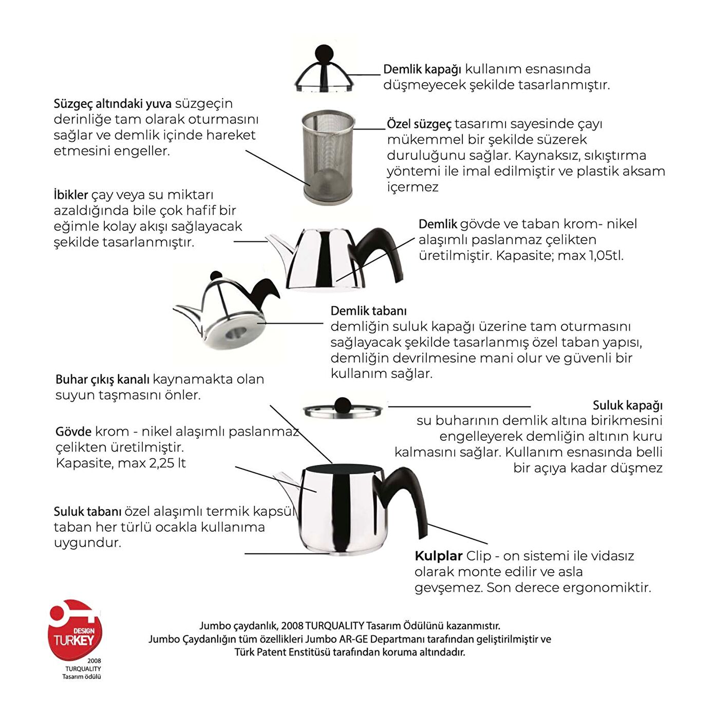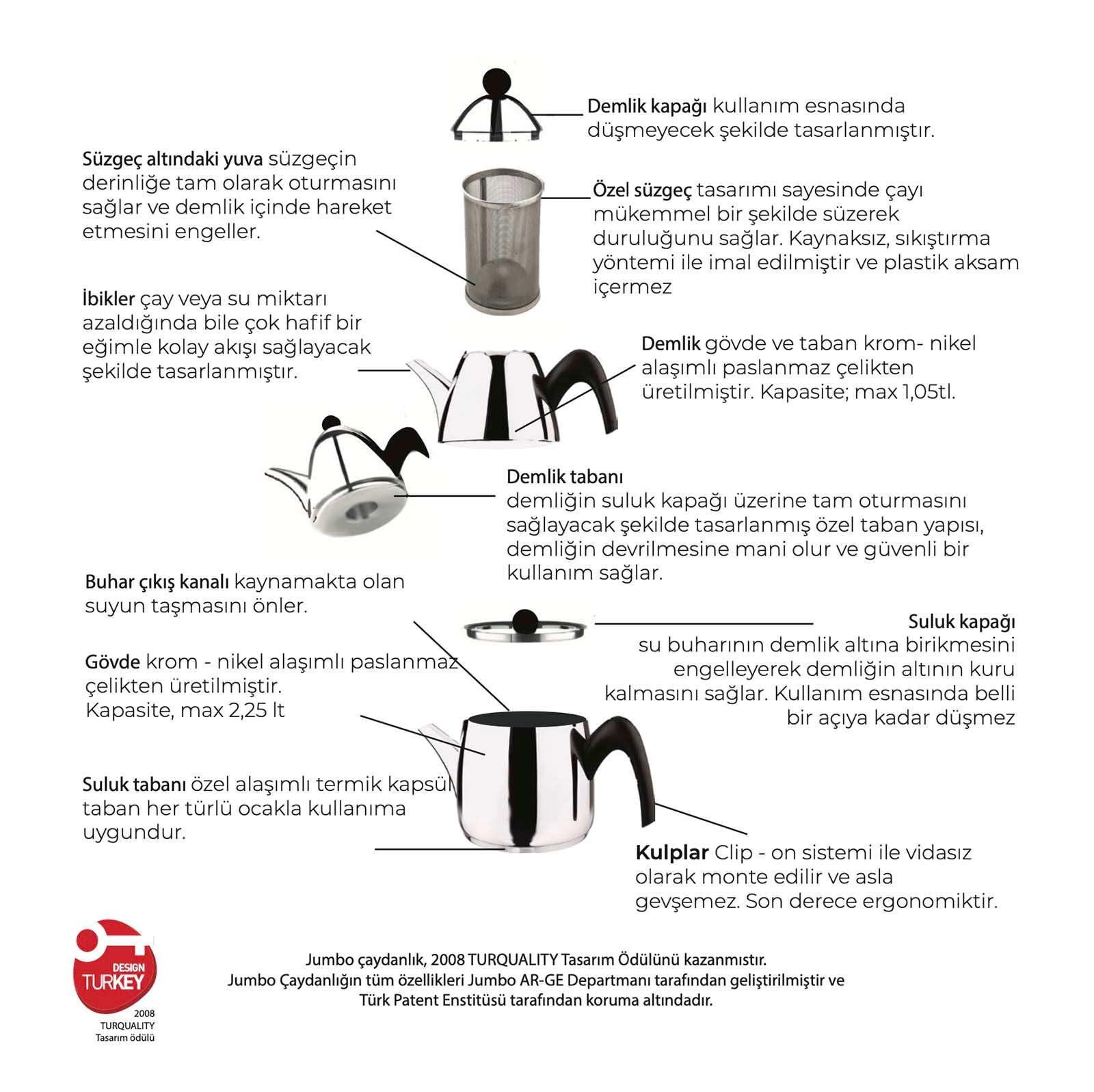 Son dönemde çay makineleri sıkça kullanılmaya başlasa da ateşin üzerinde demlenen çayın tadı hiç bir şeye değişilmiyor. Klasik demleme yöntemleriyle teknolojinin sunduğu kolaylıkları bir araya getiren Jumbo 6500 çaydanlık büyük kullanım avantajı sağlıyor. Son derece kaliteli malzemelerden üretilen bu ürün, her tür ocakta kullanılabiliyor. İndüksiyon dahil farklı ocak tiplerinde kullanılabilmesinin yanı sıra bulaşık makinesinde yıkanabiliyor olması da önemli bir kolaylık. Ayrıca toz çay çeşitlerinde büyük avantaj sağlayan süzgeç sistemi de Jumbo 6500 çaydanlığı öne çıkaran özelliklerden. Bu süzgeci, kullanım sonrası kolayca boşaltabilir ve zahmetsizce temizleyebilirsiniz. Paslanmaz çelikten üretilen tüm parçalar sağlığınızı tehdit etmiyor. Jumbo 6500 çaydanlık yorumlarda da kullanıcılardan tam not alıyor. Siz de hem şık hem de kullanışlı bir model arıyorsanız her tarzdan çay servis aksesuarlarıylada uyum sağlayabilecek Jumbo 6500'ü tercih edebilirsiniz.