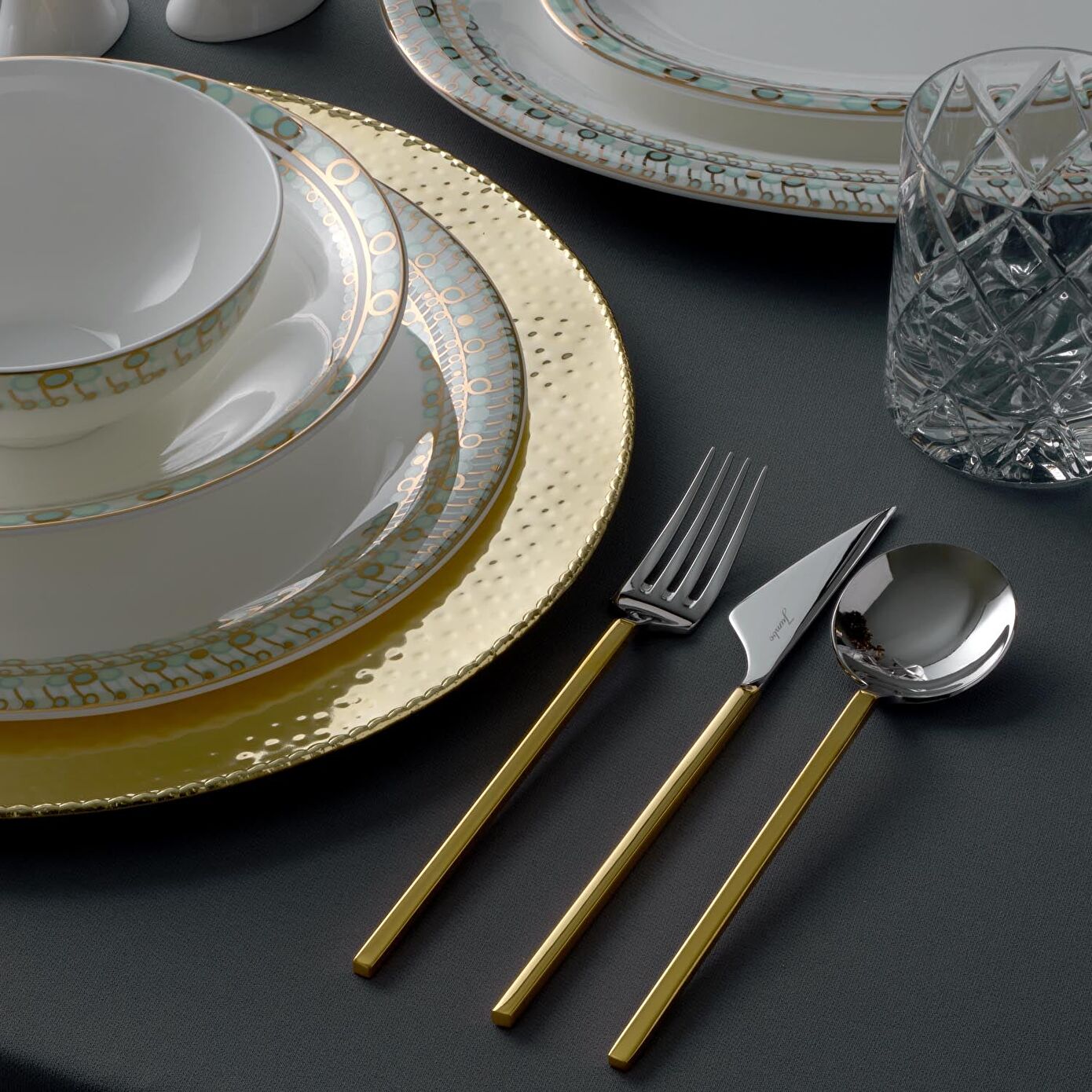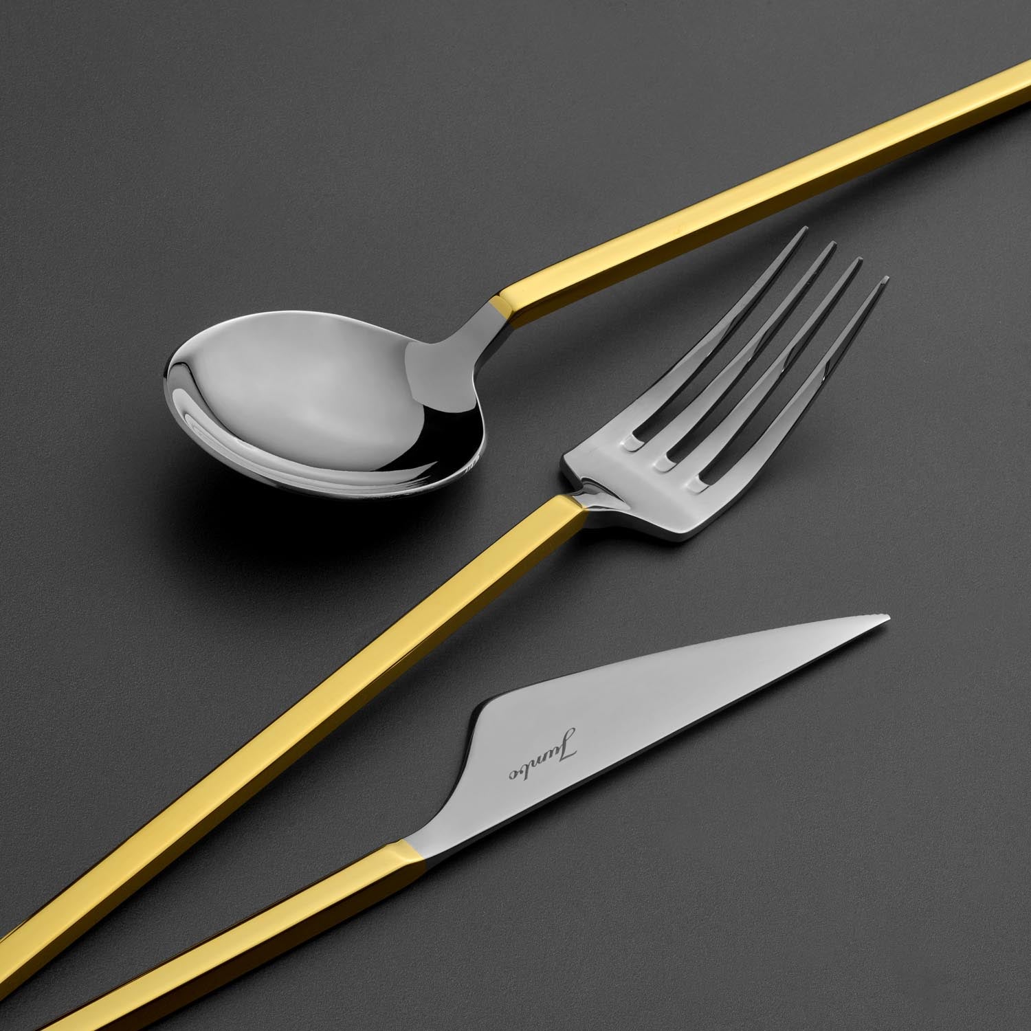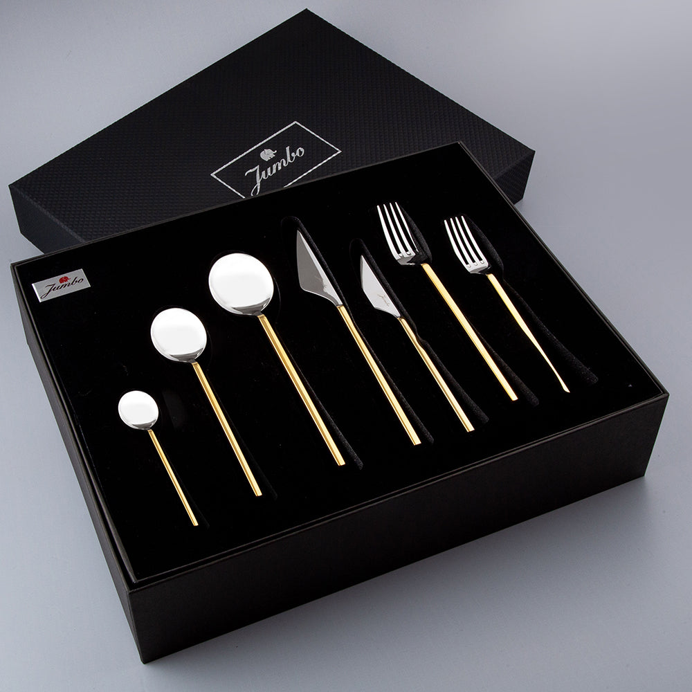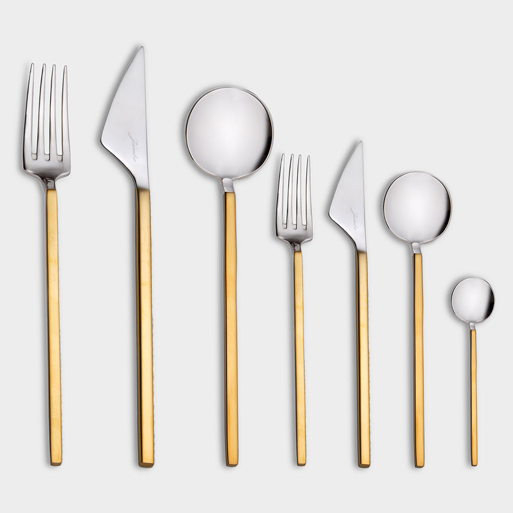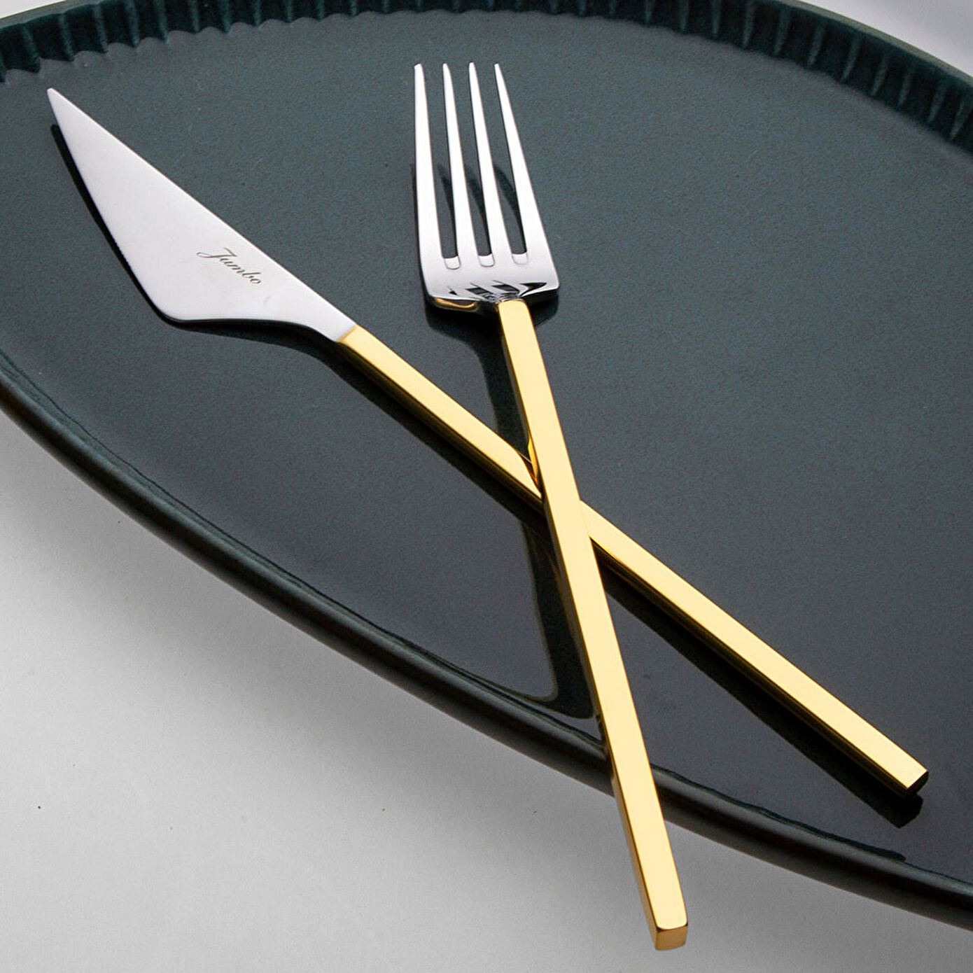 Geleneksel olarak tek renk olarak gümüş renkte üretilmesi tercih edilen çatal kaşık bıçak takımları, Jumbo 9100 altın çatal kaşık bıçak takımı ile bambaşka bir boyut kazanıyor. Hem gold hem silver tonların bir araya geldiği bu olağandışı tasarım, sofralara yerleştirildiği andan itibaren tüm konukları kendisine hayran bırakmayı garantiliyor. Üstelik form olarak köşeli ve kareli hatlara sahip olduğu için şekil itibariyle de klasik çatal kaşık bıçak takımlarına meydan okumayı başarıyor. Kısacası eşi benzeri olmayan bu takım, en modern sofraların baş tacı olmaya şimdiden aday.