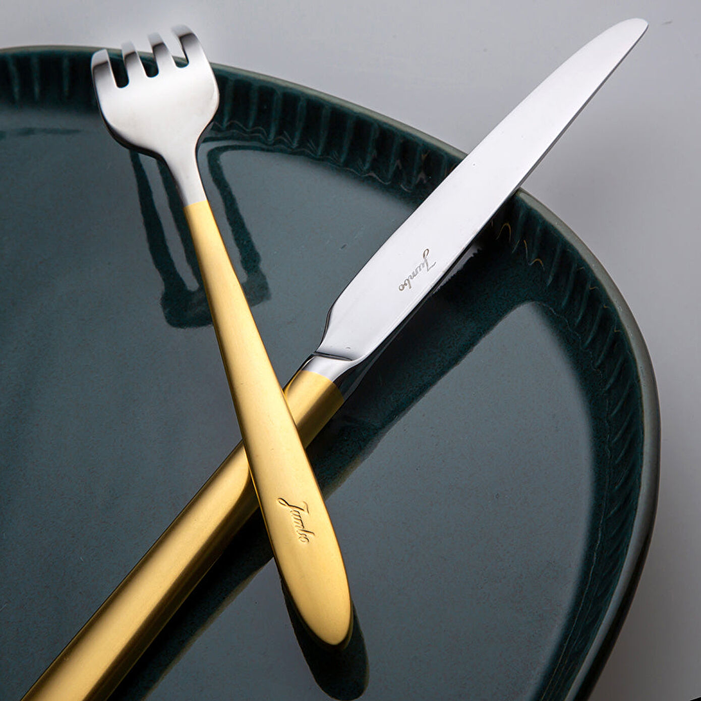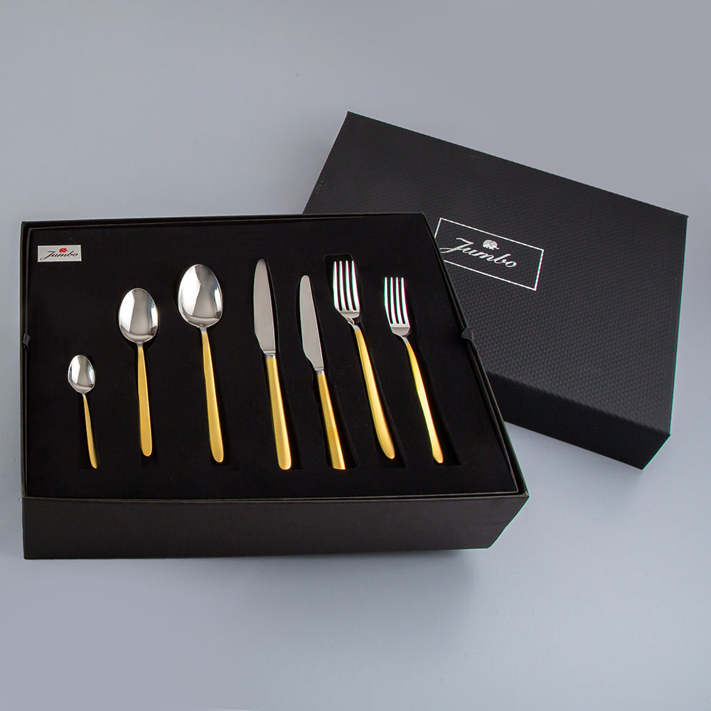 JUMBO 9400 MAT ALTIN 84 PRÇ 12 KİŞİLİK ÇKB SET düalitenin en şık örneklerinden. Mat altın ve parlak çelik renklerinin bir arada sergilendiği bu 12 kişilik 84 parça çatal bıçak takımına sadece birkaç tıkla kolaylıkla sahip olmak mümkün. İster çeyizler için ister özel konuklar için düşünebileceğiniz bu Jumbo kalitesi, eksiksiz ve şık sofraların olmazsa olmazı. Tek yapmanız gereken ürünü sepetinize eklemek. Alışverişinizi tamamladığınızda satın aldığınız bu çatal kaşık bıçak takımı, kısa süre içinde adresinize geliyor. Siz de şık yemek takımlarınızın yanında böyle güzel ve özel bir çatal bıçak seti tercih ederseniz ürünümüzü incelemeye hemen başlayın!