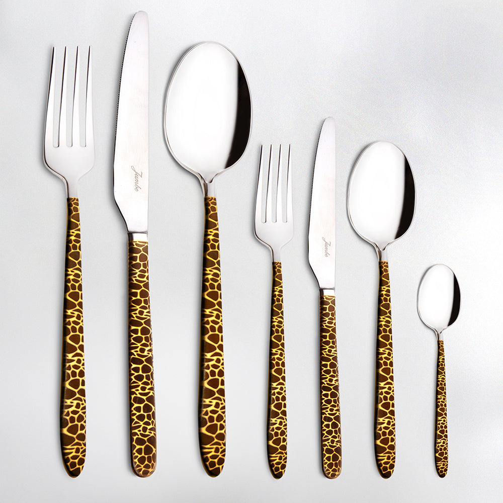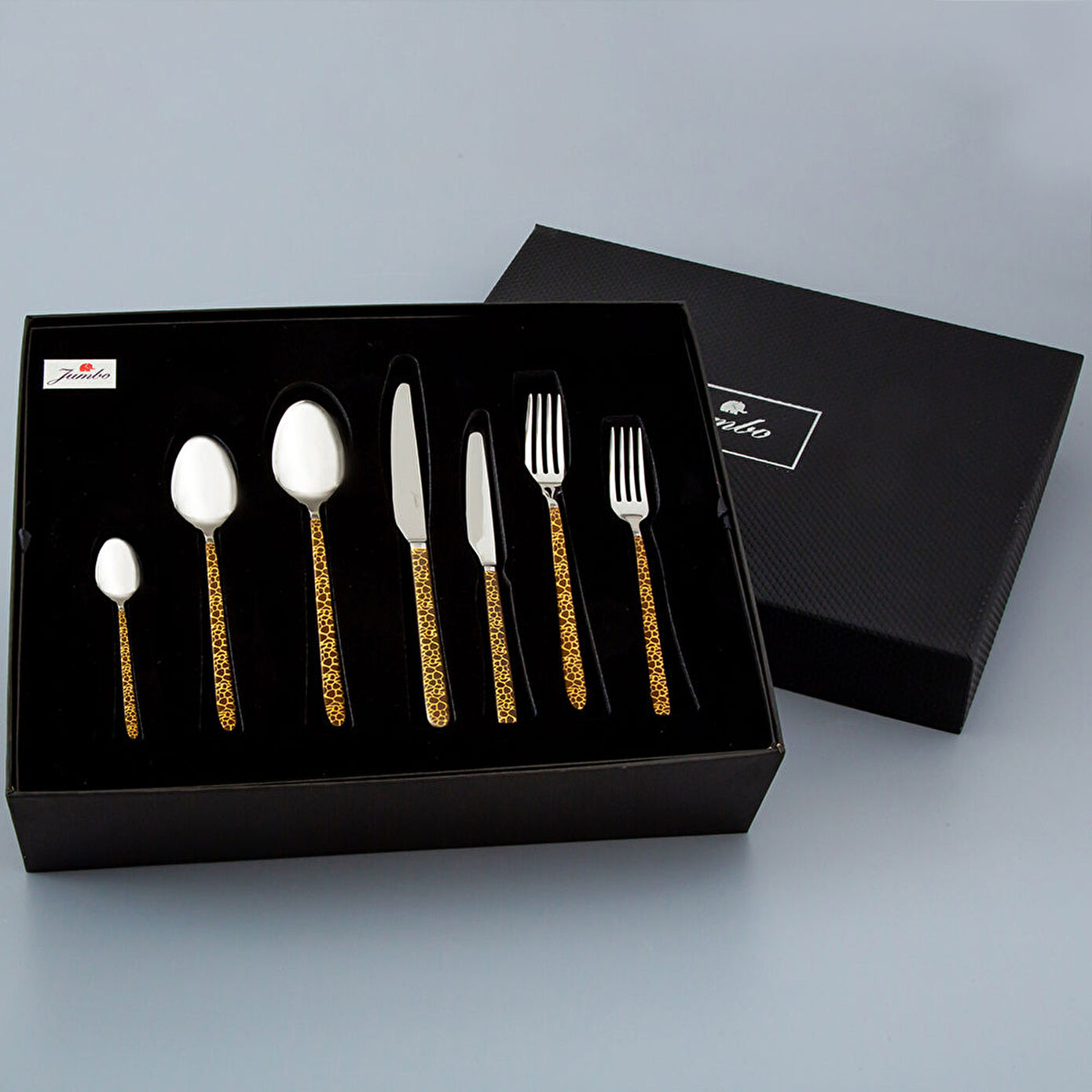 Jumbo 9400 Safari 12 kişilik 84 parça black gold çatal kaşık bıçak takımı, 18/10 paslanmaz çelik malzemeden üretilerek sofranıza geliyor. Bu takımda, bir sofrada ihtiyaç duyulan tüm temel parçalar mevcut. Her birinden on ikişer adet olmak üzere özel tasarım yemek kaşığı, yemek çatalı ve yemek bıçağının yanı sıra tatlılarda kullanabileceğiniz kaşıklar, çatallar, bıçaklar ve çay kaşıkları da kutu içinde yer almakta. Siz de sofranızda Safari'nin eşsiz güzelliğini görmek isterseniz ürünü hemen şimdi satın alabilir, konuklarınıza unutulmayacak masalar hazırlayabilirsiniz.