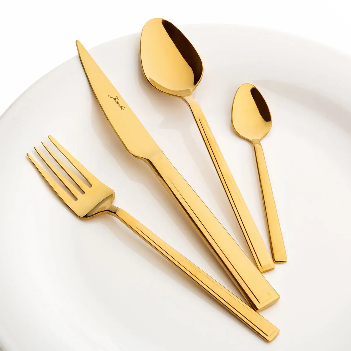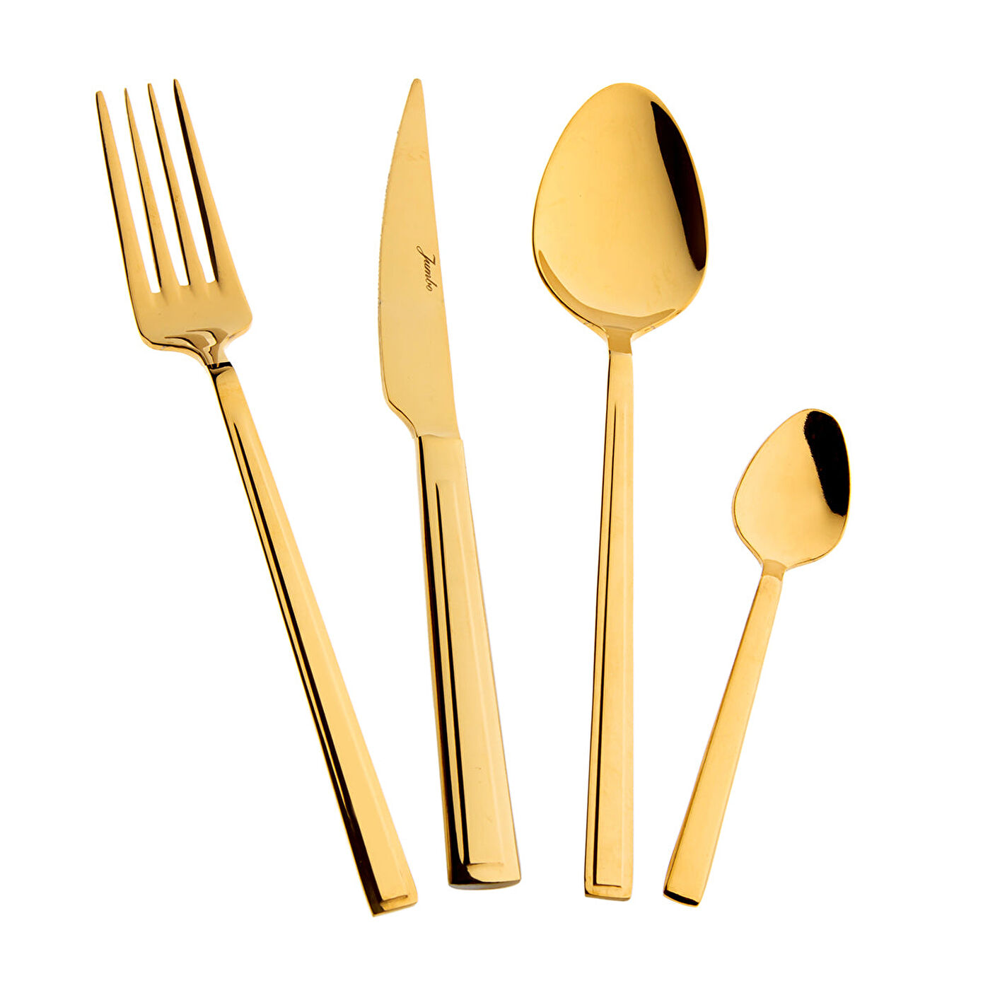 Jumbo Athena 6 kişilik titanyum gold tatlı çatal kaşık bıçak takımı ile sofralarınıza ve mutfaklarınıza benzersiz bir şıklık katabilirsiniz. Tatlı servislerinizi özel hale getireceğiniz Jumbo Athena çatal kaşık bıçak takımı titanyum gold kaplamaya sahip olup paslanmaz çelikten üretiliyor. Böylece altın renginin ışıltısıyla yemek masalarınızı tamamlayabilmenize imkân tanıyor. 6 kişiye kadar servis açabileceğiniz bu tatlı çatal kaşık bıçak takımı 24 parçadan oluşarak tatlı ikramlarında ihtiyaç duyulan servis gereçlerini size sunuyor. Hem şık hem kullanışlı olmaları ile gerek yemek masalarında gerek masa dışı tatlı ikramlarınızda kolaylık sağlıyor. Özenle tasarlanan Athena tatlı çatal kaşık bıçak takımı kabartmalı dikdörtgen şekilleri ile şık bir görüntü sunuyor. Siz de her mutfakta olması gereken bu tatlı çatal kaşık ve bıçak takımına sahip olabilmek için hemen sepetinize ekleyebilirsiniz.