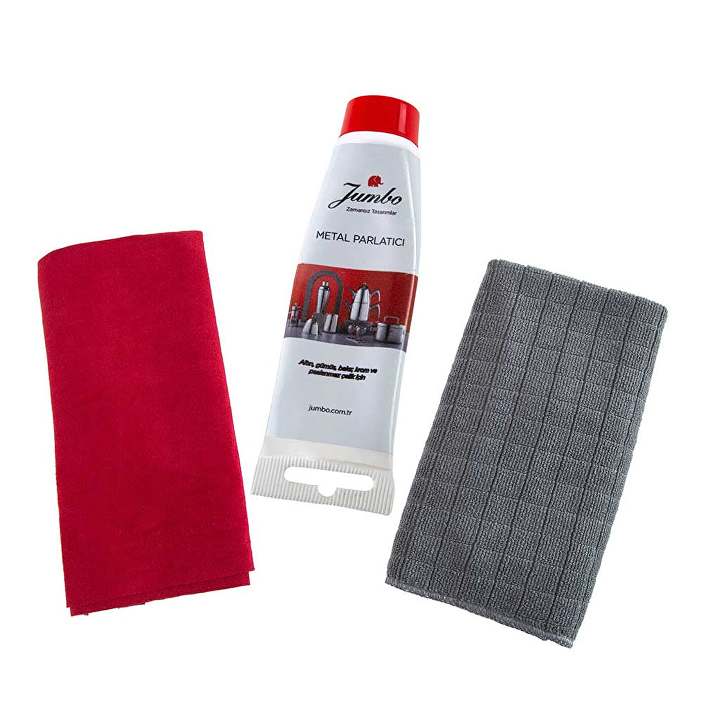 Jumbo çelik temizlik seti altın, paslanmaz çelik, gümüş, bakır, pirinç ve krom gibi materyallerden yapılan çeşitli mutfak ürün gruplarının temizliği için oldukça uygundur. Bu sayede krom süslemelerden paslanmaz çelik çatal kaşık bıçak takımına, gümüş tepsilerden tencere setlerine kadar mutfak ekipmanlarınızı oluşturan pek çok ürün için bu sete sahip olabilirsiniz. Bu sayede sahip olduğunuz farklı pek çok mutfak ürününüzü yüksek hijyen standartları ile buluşturabilir, ürünlerinizin ömrünü uzatabilirsiniz. Setin içerisindeki parlatıcı sayesinde ürünlerinizi eski parlaklığına, dikkat çekici ve gözde görünümüne ulaştırabilirsiniz. Temizlik ve bakım setinin diğer ürünleri içerisinde ise parlatma bezi ve temizlik bezi bulunuyor. Böylece dört dörtlük bir parlatma, bakım ve temizlik rutinleri oluşturabilirsiniz. Set içerisindeki parlatıcı ürünü, kapağı açıp ürünler üzerine uygulanabilmesi bakımından da oldukça pratik. Siz de mutfak grubu ürünlerinizin parlaklığını korumak, bakımlarını sürdürmek için sayfamızdaki ürünü satın alabilirsiniz. Arzu ederseniz, Oda Parfümü ve Kolonya sayfamızdaki ürünleri de inceleyebilirsiniz.