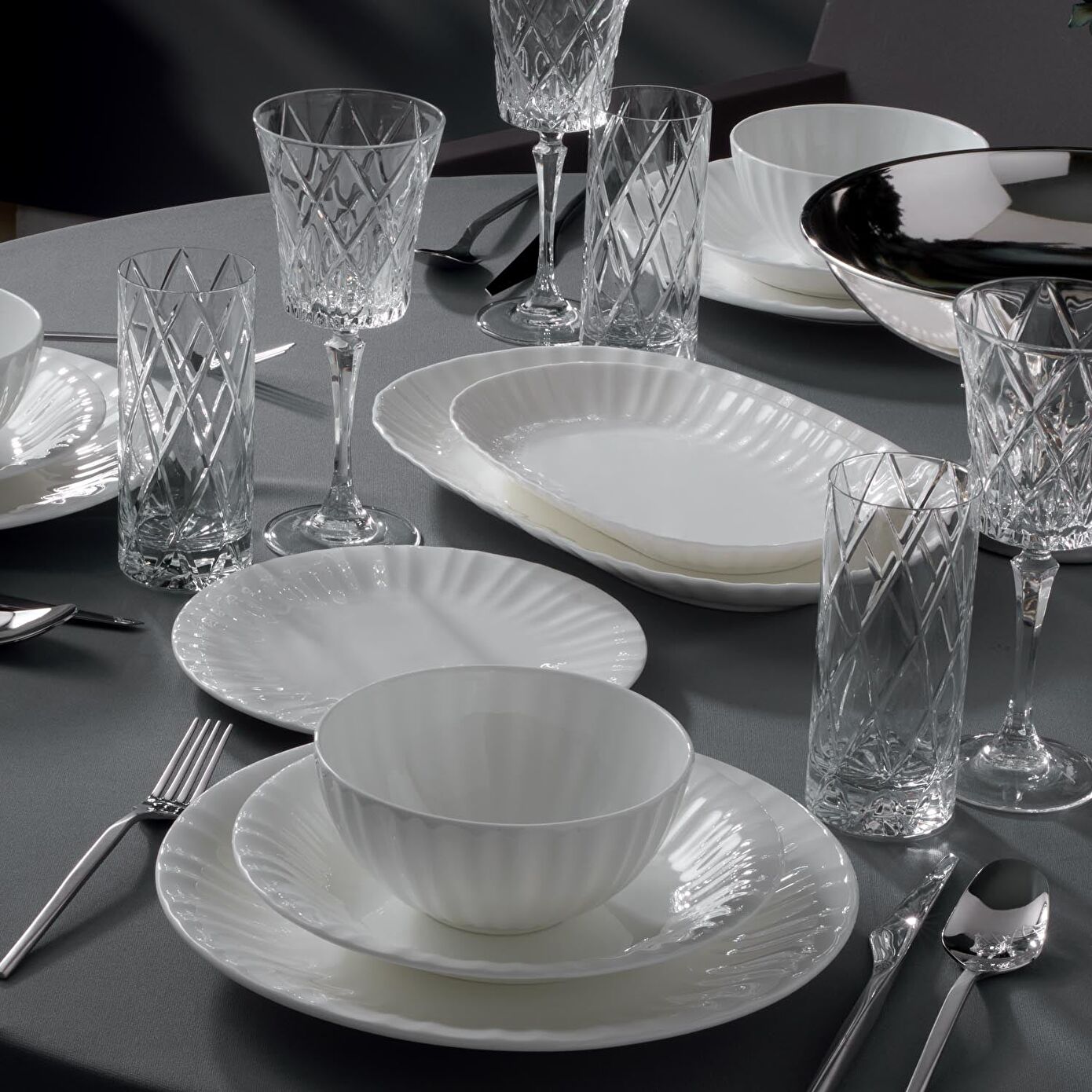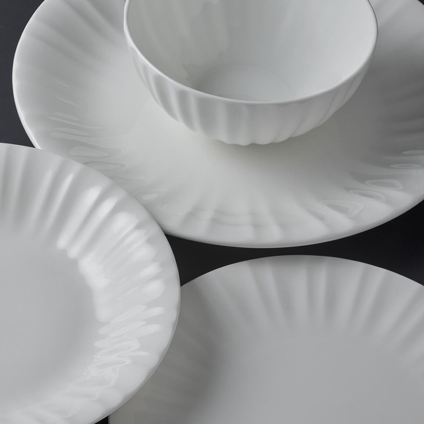 Claro 26 parça 6 kişilik yemek takımı, fine bone malzemesinden gelen beyazlık, şeffaflık ve transparanlık ile de kendine özgü tasarım özelliklerine kavuşuyor. Beyazlığı bir seviye daha artıran fine bone malzemesi, böylece Claro yemek takımlarında da kendisini belli ediyor. Ayrıca pürüzsüzlük ve şeffaflık gibi unsurlar da takımı oldukça özgün bir noktaya taşıyor. Takımın iç yüzeyinde, kenarlarda kendini belirgin bir şekilde gösteren izler de oldukça hoş bir şekilde son noktayı koyuyor. Bu sayede hem sade hem modern ve şık bir tasarım diline kavuşan Claro 6 kişilik yemek takımı, sofra estetiğinize ciddi ölçüde katkı sağlıyor. Servis tabağından çorba kasesine, kayık tabaktan yemek tabağına kadar pek çok tabak çeşidine ulaşabileceğiniz Claro yemek takımı ile siz de birbirinden leziz yemeklerinizi şık bir şekilde servis edebilir, menünüzün tüm yemeklerine uygun servis gereçlerine sahip olabilirsiniz.