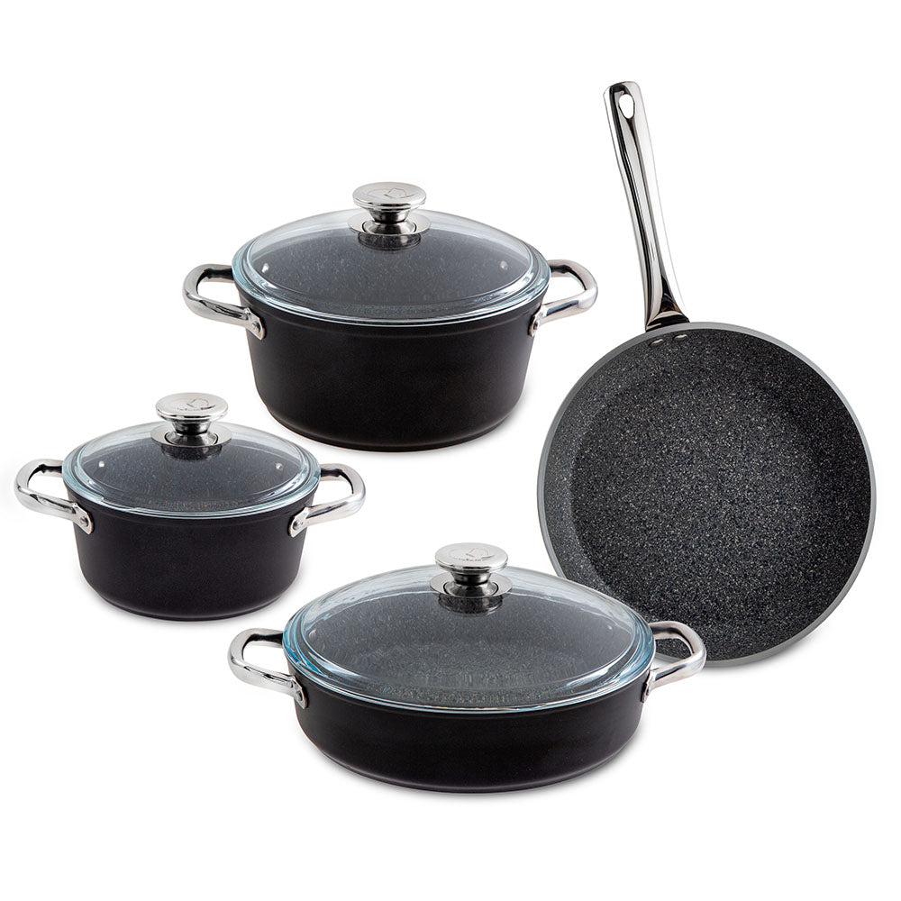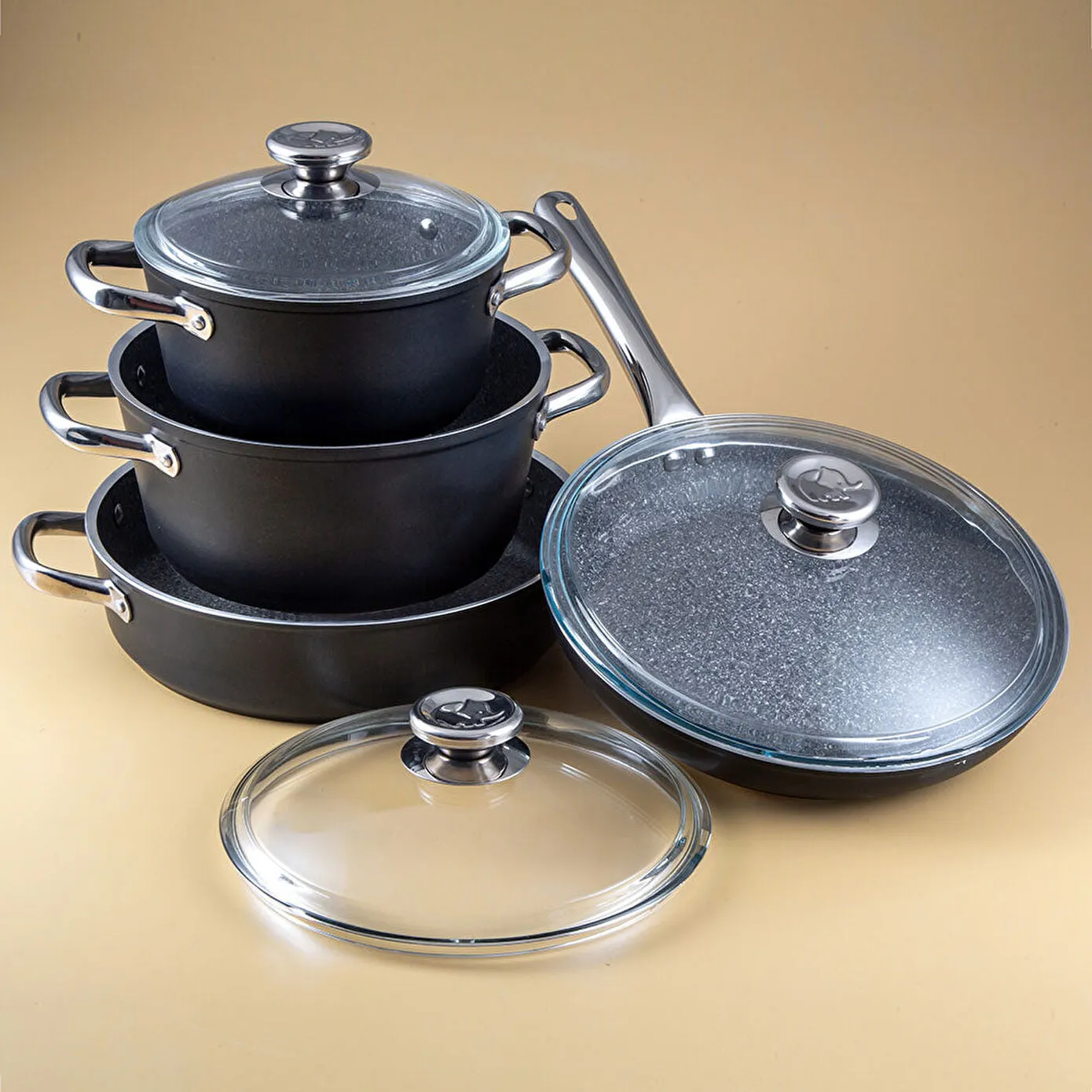 Mutfağınıza sağlık, konfor ve ihtişam getirmek istiyorsanız doğru adrestesiniz. Jumbo Darci Black tencere seti kusursuz tasarımı ve fonksiyonel yapısıyla vazgeçilmeziniz olmaya geliyor! Bu sette bulunan parçalar zengin bir mutfak için gerekli olan tüm ihtiyaçlarınız için tasarlanıyor. Sevdikleriniz için zengin ve lezzetli bir sofra kurmak istediğinizde daima Jumbo Darci Black tencere setine güvenin! Profesyonel mutfak ekipmanlarını aratmayacak kaliteye sahip olan bu set tasarımıyla da görenleri büyülüyor. Mat siyah tonlarının sunduğu asil atmosfer birçok mutfak stiline uyum sağlayabiliyor. Mutfağınızda görünümüyle fark yaratacak bir tencere seti arıyorsanız Jumbo Darci Black tam size göre! Bu setin ihtişamlı görünümü sofralara da çok yakışıyor. Yemek servislerinizi sofradan yapmayı tercih ettiğiniz durumlarda Jumbo Darci Black tencere seti daima yanınızda. Yemeklerinizi sağlıkla pişirirken estetik görünümden ödün vermek istemiyorsanız hemen Darci Black tencere setini sepetinize ekleyin!