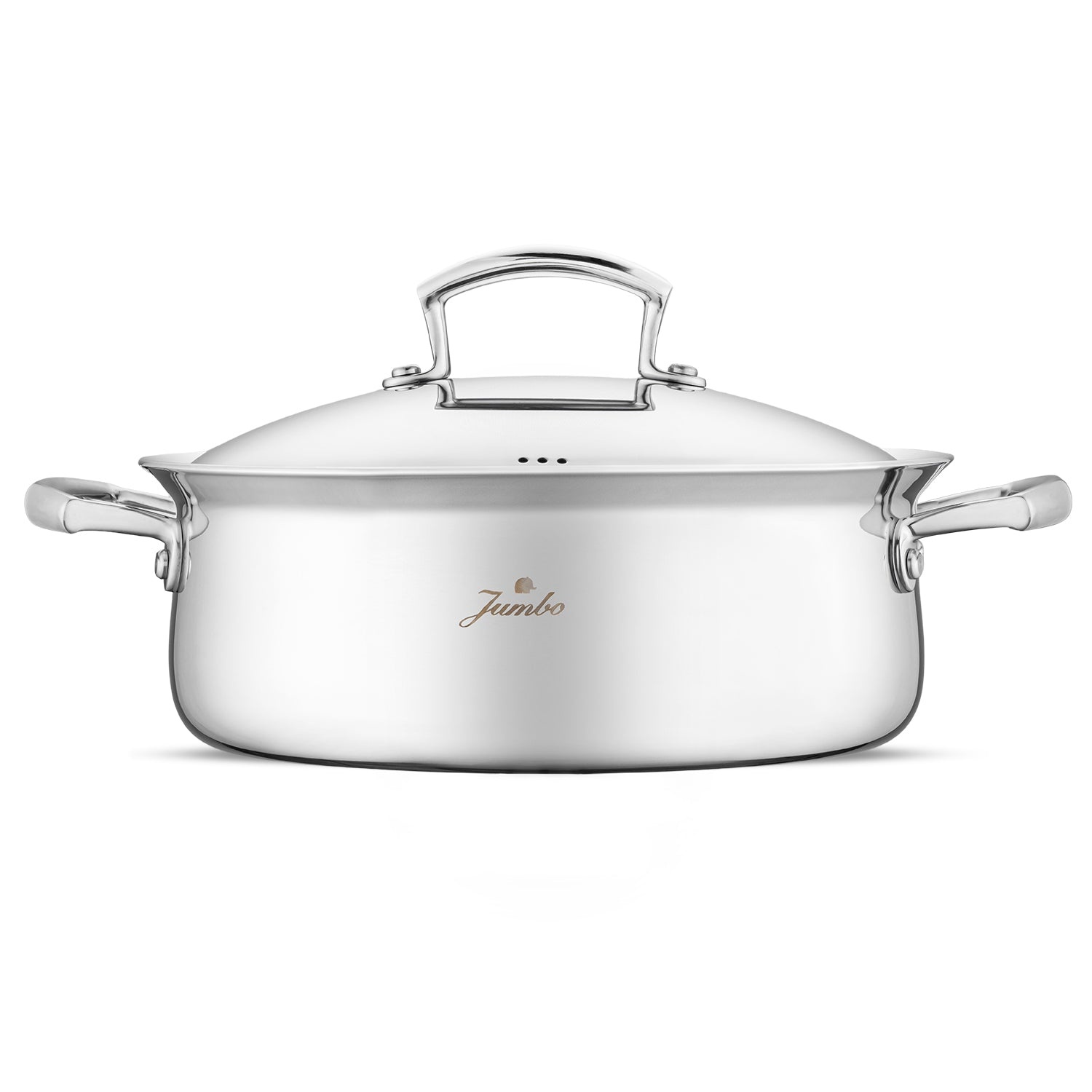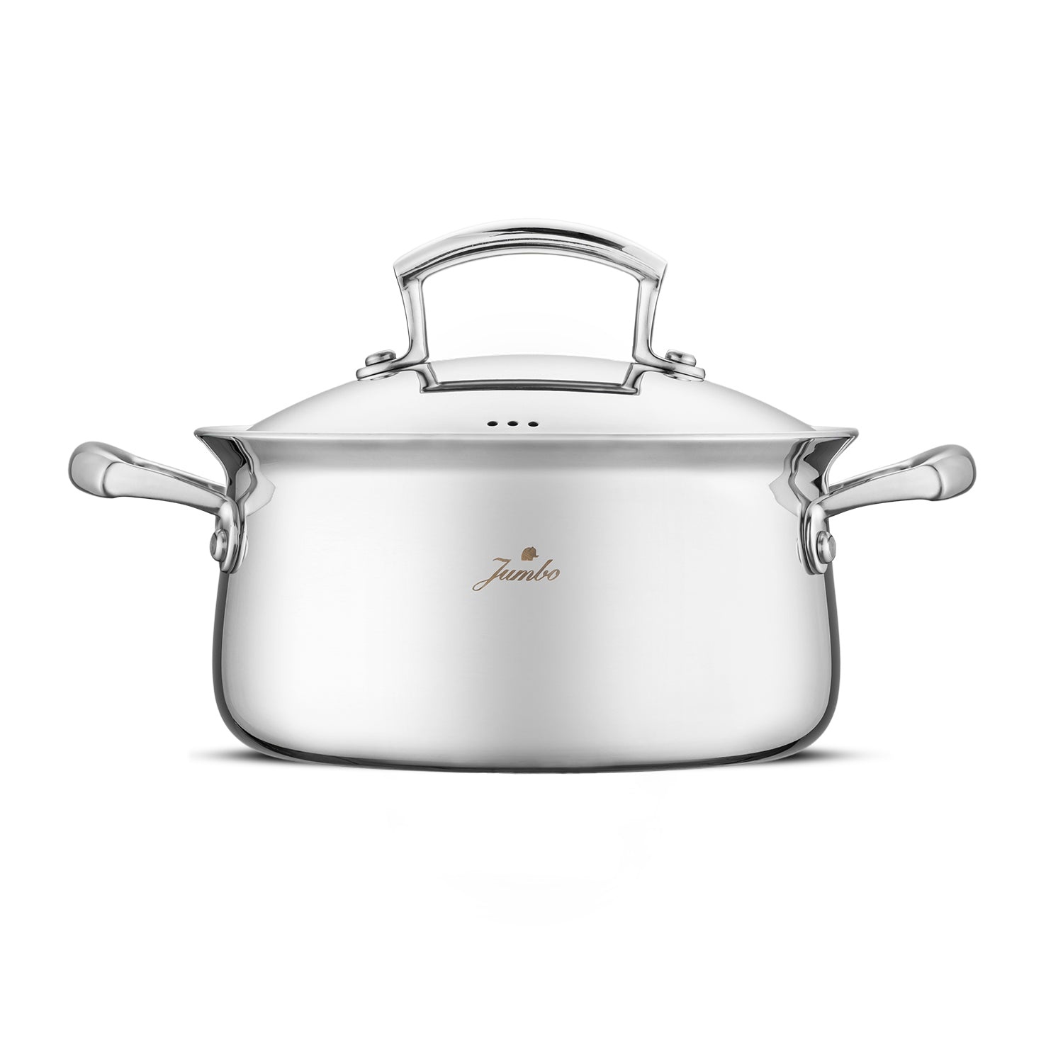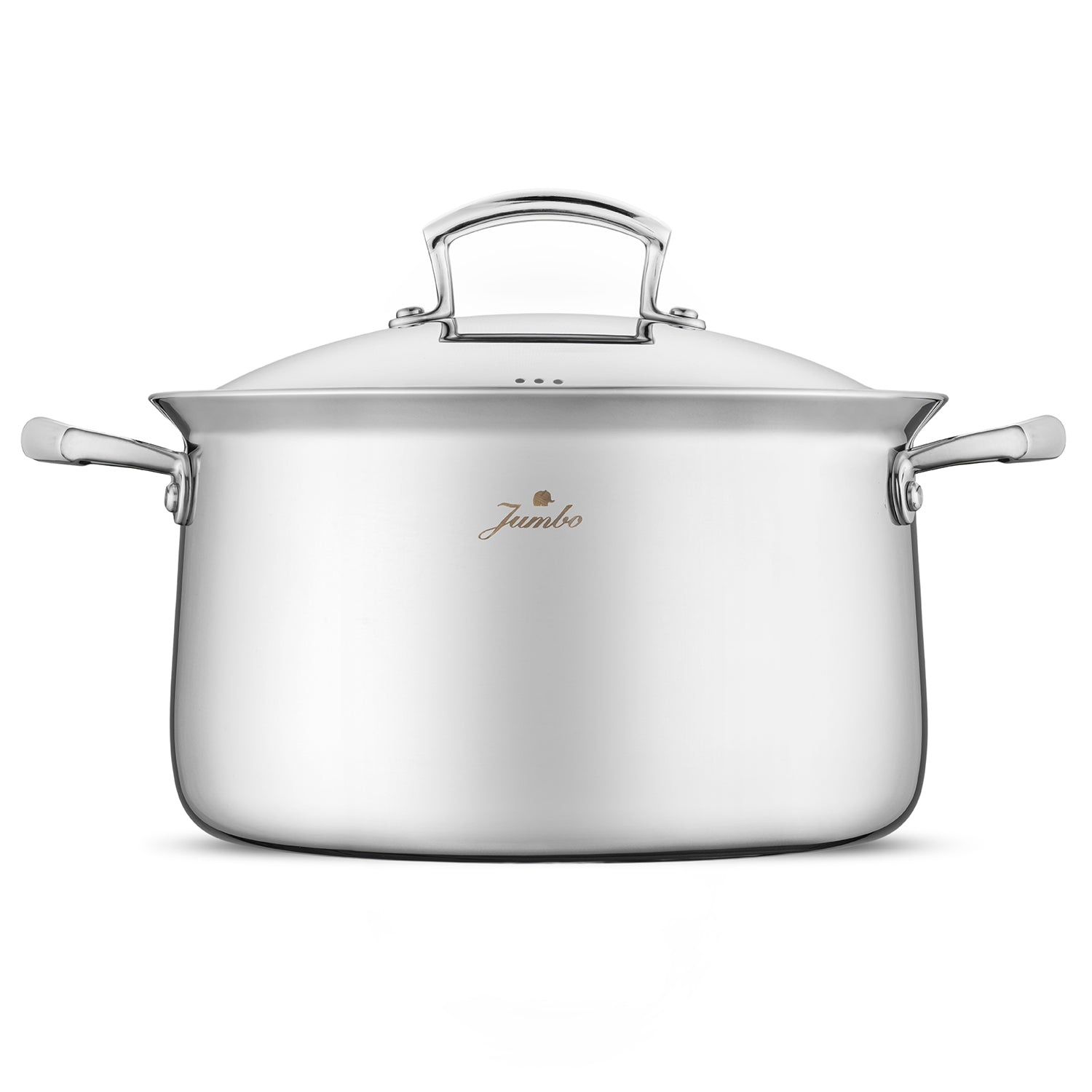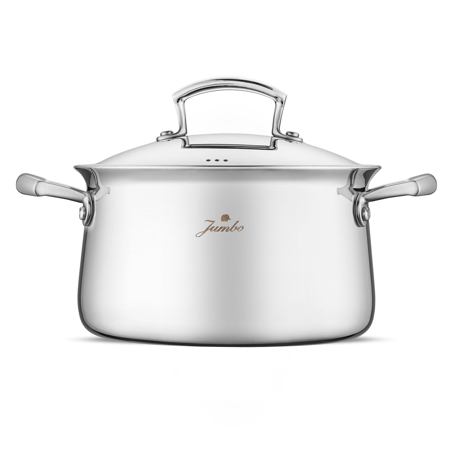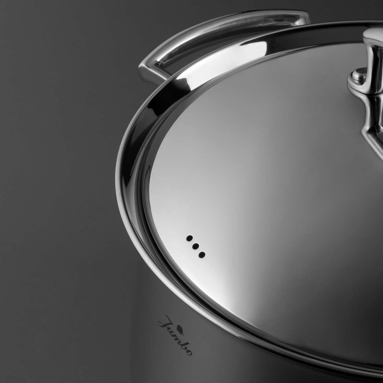 - Jumbo 5 ply tencereler, ısıyı homojen bir şekilde dağıtarak yemeklerin eşit pişmesini sağlar. Alüminyum Ara katmanlar, ısının hızla yayılmasına yardımcı olur, bu da pişirme süresini kısaltır ve enerji tasarrufu sağlar.