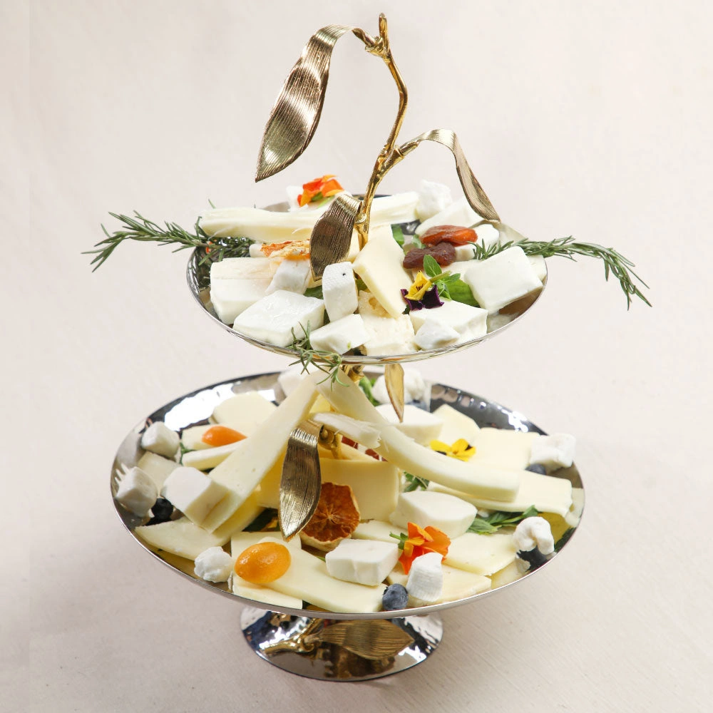 İki katlı sunumlukların revaçta olduğu günümüzde Jumbo Leaf 2 katlı servislik, kendine has tasarımını ve özgün yapısını ön plana çıkartarak adından söz ettirmeyi başarıyor. Çift katlı yapısı sayesinde oldukça geniş bir kapasite sunan bu ürün, ikramlarınızı, atıştırmalıklarınızı ve aperatiflerinizi sunmanın en şık yollarından birini oluşturuyor. Bu ürünün zarif tasarımı, her iki katı birbirine bağlayan gold detaylı ağaç dalı dizaynıyla adeta şahlanıyor. Böylece gold ve silver tonları bu üründe bir arada kullanılarak ortaya harika bir karma tasarım çıkıyor. Yine paslanmaz çelikten üretilen ve biri küçük biri büyük iki servis tabağına birbirine bağlama görevi üstlenen gold sap parçası, şık yaprak detaylarıyla bezenerek servisliği doğal bir görünüme kavuşturuyor. Her bir ayrıntısı ince düşünülmüş ve hesaplanmış olan bu harika servisliğe siz de hemen şimdi Jumbo farkıyla sahip olabilir ve sunumlarınızda gönül rahatlığıyla kullanabilirsiniz.