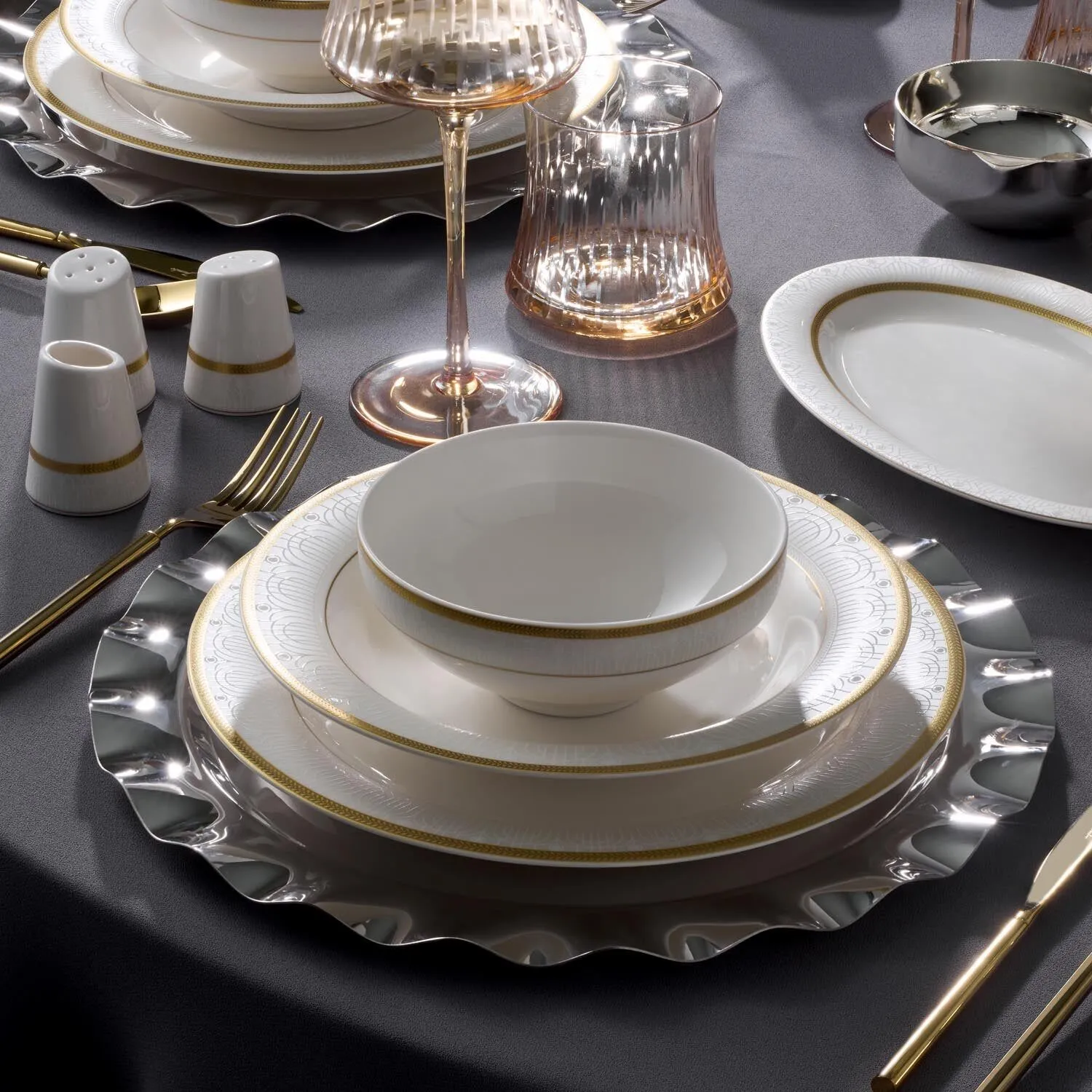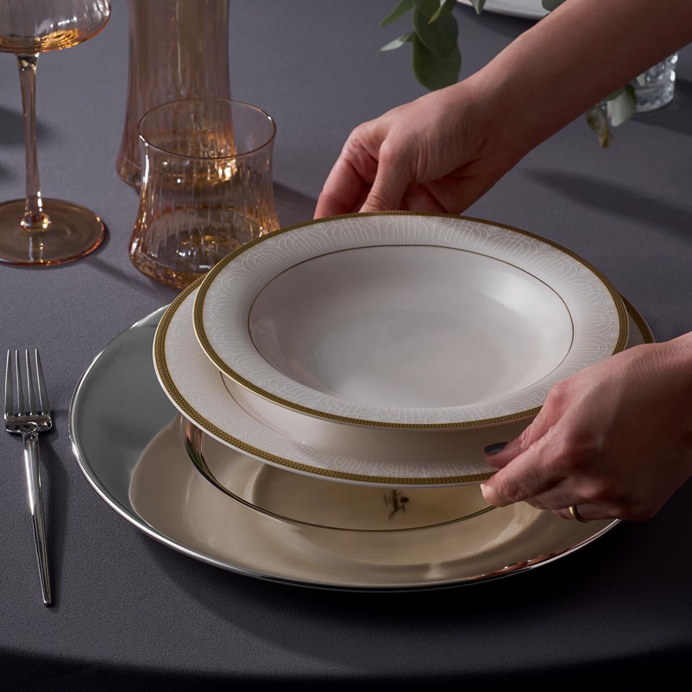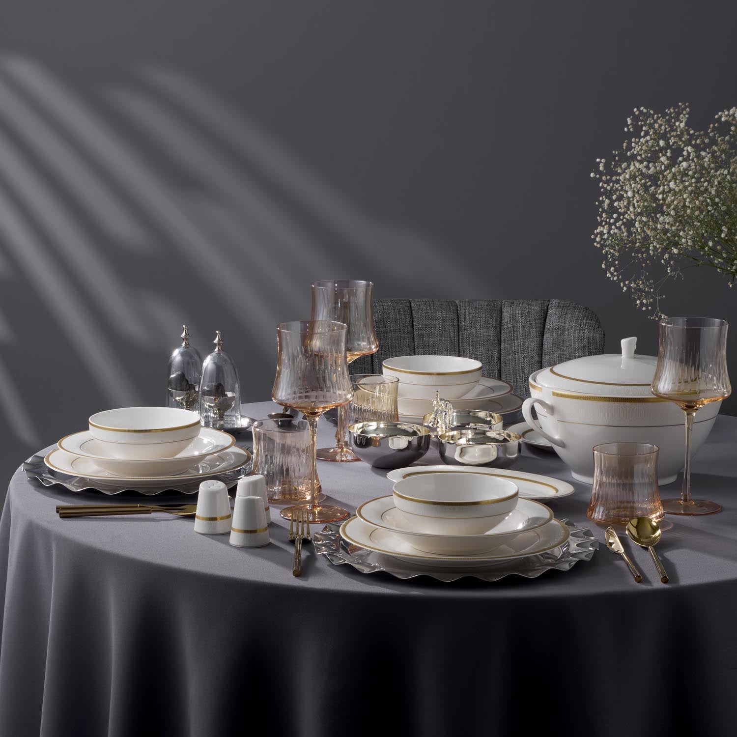 - Sofranızda şıklığı tamamlamak için kristal bardaklar ve altın detaylı aksesuarlarla kombinleyin.