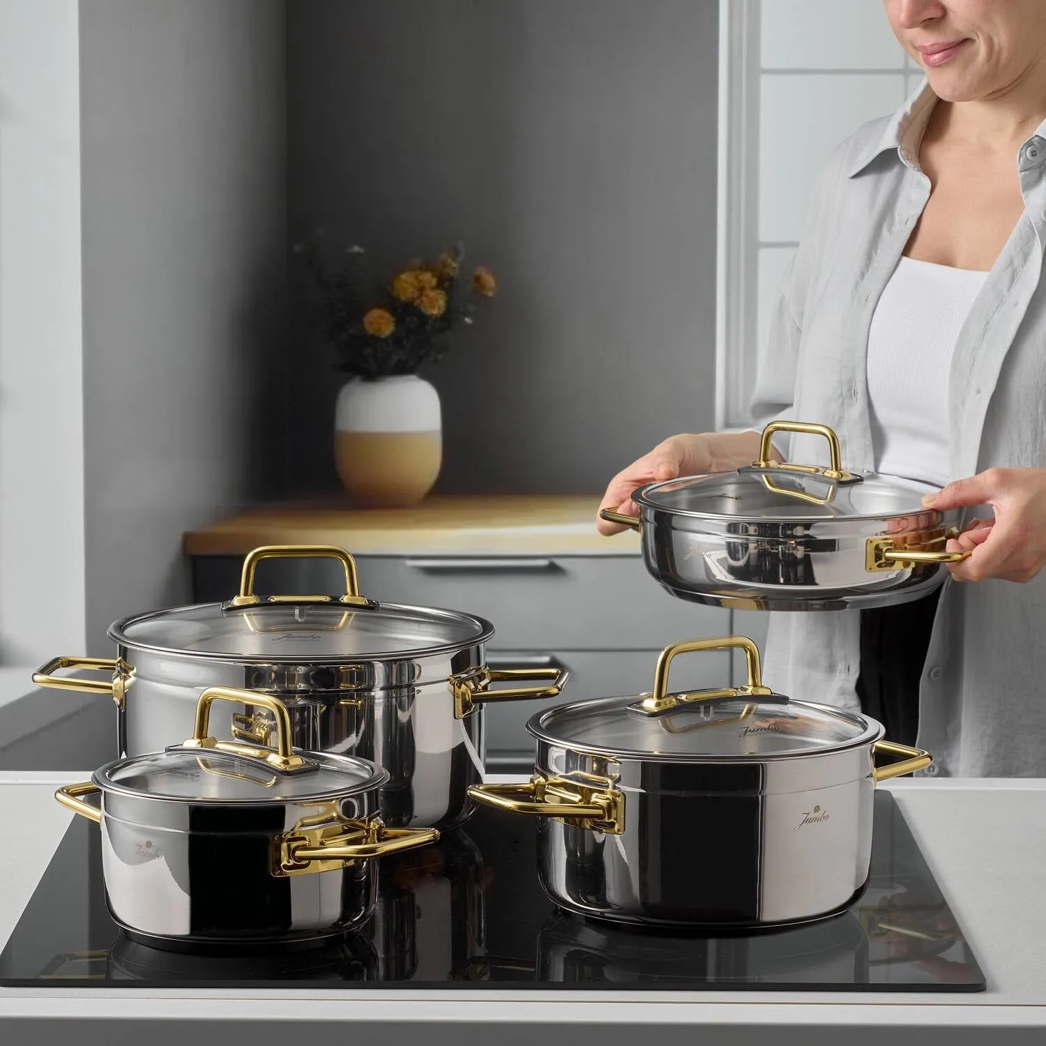 Jumbo Modena 8 parça tencere takımı işlevsel set içeriğinin yanı sıra tasarımıyla da mutfakları zenginleştiriyor. Her detayının özenle tasarlandığı bu set ihtişamlı ve zarif mutfak görünümleri için birebir. Jumbo Modena tencerelerinin altın kulpları adeta klasik şıklığın simgesi. Bununla birlikte tencereleri çevreleyen titanyum çelik materyalinin parıltısı gold renginin çekiciliğini destekler nitelikte. Mutfağınızda zamansız ve çarpıcı bir stil tercihinizse doğru adrestesiniz. Söz konusu mutfak ve yemek hazırlama olduğunda kusursuzluktan yanaysanız Jumbo Modena tencere seti vazgeçilmeziniz olacak. Tüm bunlara ek olarak bu set kullanım konusunda kullanıcılardan tam not almayı başarıyor. Bulaşık makinesinde temizlenmeye uygun yapıya sahip olan bu seti pratik bir şekilde temizleyebilir, sonraki yemek hazırlığına tertemiz başlayabilirsiniz. Mutfağınızda farklı lezzetleri ustaca hazırlama konforu için sitemizdeki sahan ve sahan seti modellerini de incelemeden geçmeyin!