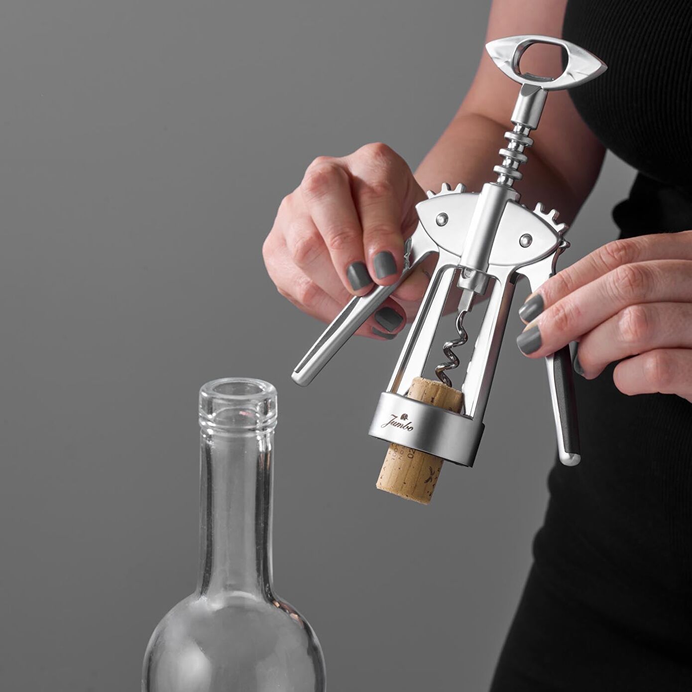 Jumbo Shark tirbuşon çinko alaşımlı özel bir malzemeden imal ediliyor. Üzerinde bulunan çevirme kolu ve sivri uçlu spiral bölümü sayesinde mantar kapaklar rahatlıkla açılabiliyor. 18 cm uzunluğundaki bu ürünü kullanmak için sadece üç temel adımı gerçekleştirmeniz yeterli. İlk aşamada tirbuşonun sivri uçlu spiral bölümünü, mantarın merkez noktasına yerleştirmeniz gerekiyor. Bunu, Shark tirbuşonun yuvarlak ağzı sayesinde son derece pratik biçimde gerçekleştirmeniz mümkün. İkinci adım ise yukarıdaki kolu çevirmekten ibaret. Son olarak kolu yukarı kaldırın ve işlemi sonlandırın. İşte, bu kadar! Mantar kapağı kaldırıp içeceğinizi bardaklara paylaştırabilirsiniz. Mantar kapaklı şişelerde bulunan içecek servislerinde harcanan zamandan tasarruf ettiren Shark tirbuşonu satın almak için acele edin!