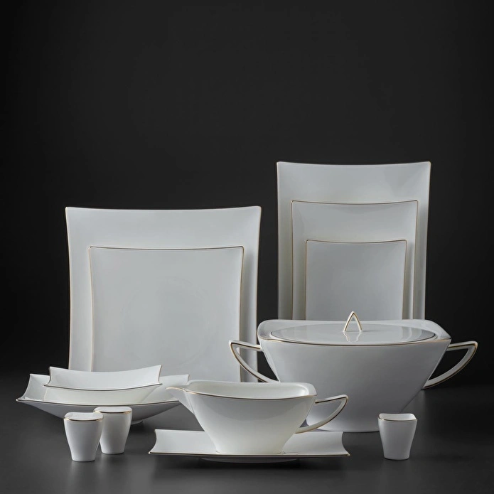 En şık davet sofralarının baş tacı olmaya aday Jumbo Wind Gold yemek takımı, eksiksiz parçaları ve hayran bırakan tasarımıyla karşınızda. Geleneksel olarak oval ya da yuvarlak formlarda tasarlanan yemek takımlarına adeta meydan okuyan bu ürün, kare formu sayesinde yerleştirildiği sofranın ilk bakışta harika bir deneyim yaratacağının sinyalini veriyor. Çorba kasesinden meze tabağına, biberliğinden çorba tenceresine kadar her bir parça kare formda tasarlandığı için set kendi içerisinde harika bir uyum yaratıyor. Tamamı beyaz renkte olan bu takımın kenar kısımlarında minimalist gold çizgiler hakim. Kısacası her bir detayı ile mükemmelliğin simgesi olan bu yemek takımıyla siz de misafirlerinizi sofranıza hayran bırakabilirsiniz.