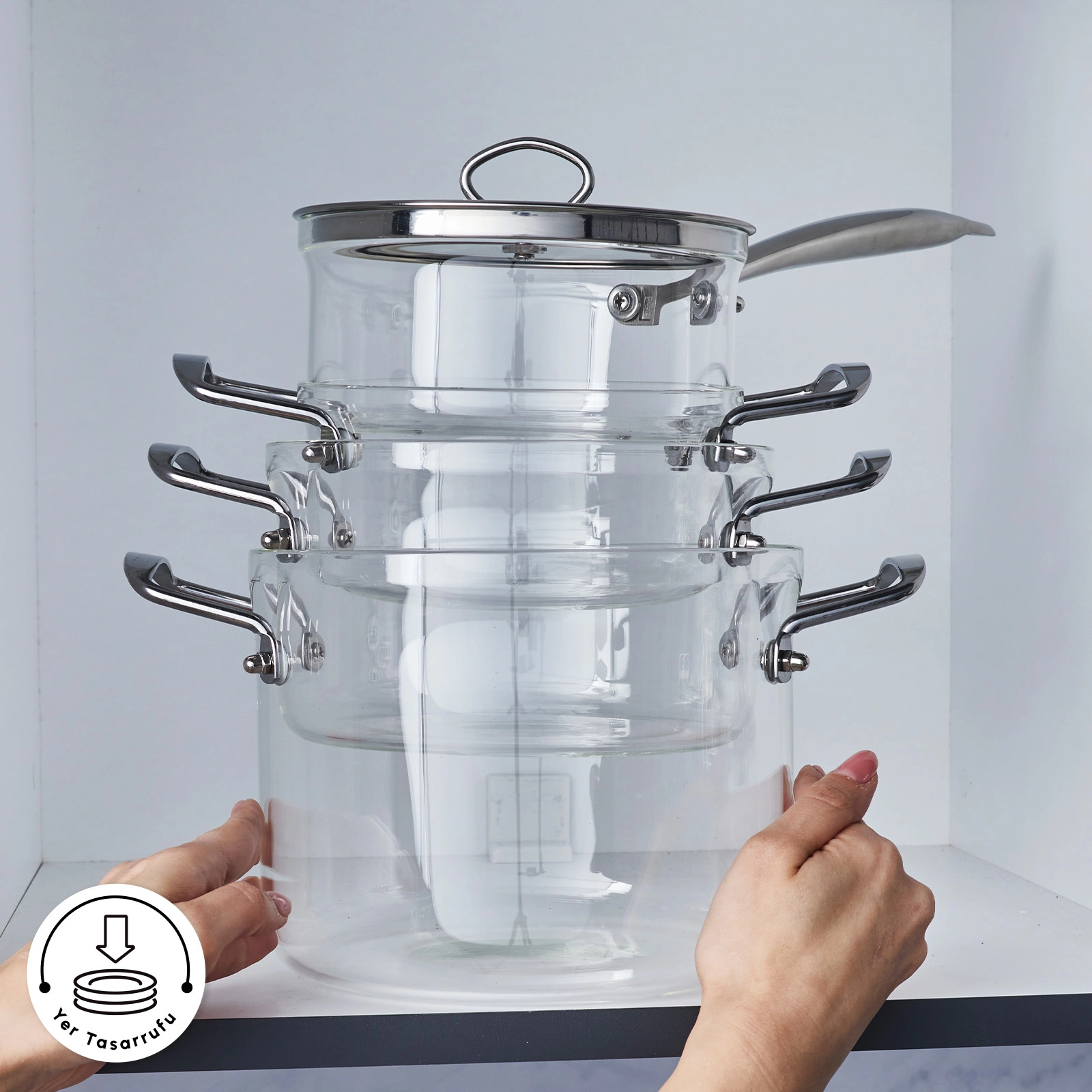 Borosilikat camdan üretilen bu özel set, sıradan camlara göre çok daha dayanıklı ve sağlıklı bir yapıya sahiptir. Isıya karşı yüksek dirençli bu cam malzeme sayesinde, yemekleriniz besin değerini kaybetmeden pişer, tatlar doğallığını korur.