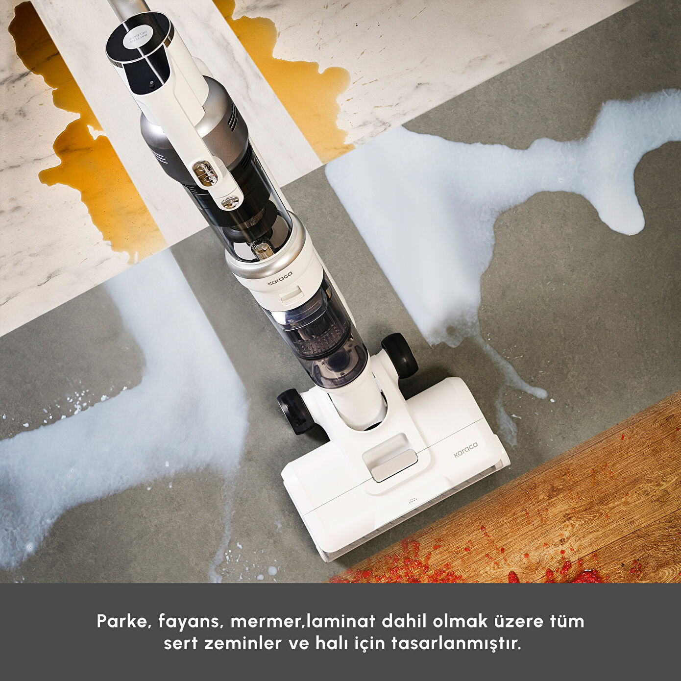 - Islak ve Kuru Kablosuz Dik Süpürge aynı anda süpürme ve silme işlemini gerçekleştirerek size zaman kazandırır. Parke, fayans, vinil, ahşap,seramik, mermer ve laminant zeminleri aynı anda süpürür ve siler.