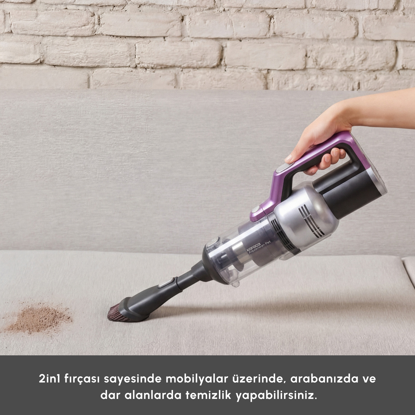 - Kablosuz dikey süpürgenizi kolayca el tipi süpürgesine dönüştürebilir, farklı aparatlar ile el süpürgesi olarak da kullanabilirsiniz. Böylelikle mobilyalar üzerinde, arabanızda ve küçük alanlarda kolaylıkla temizlik yapabilirsiniz.