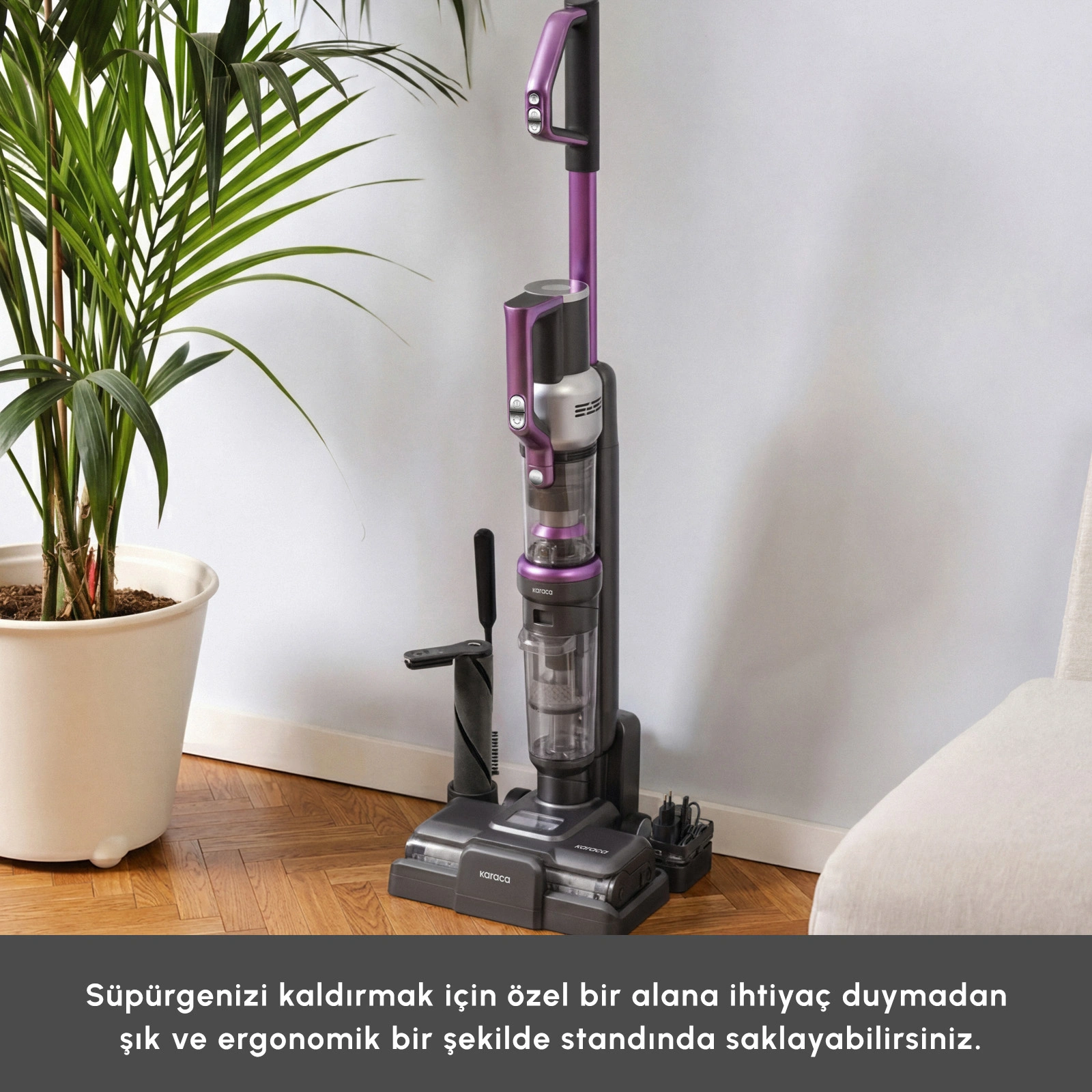 - Süpürgenizi kaldırmak için özel bir alana ihtiyaç duymadan, standı ile şarj ve saklama işlemini kolayca gerçekleştirebilir, şık ve ergonomik bir şekilde saklayabilirsiniz.