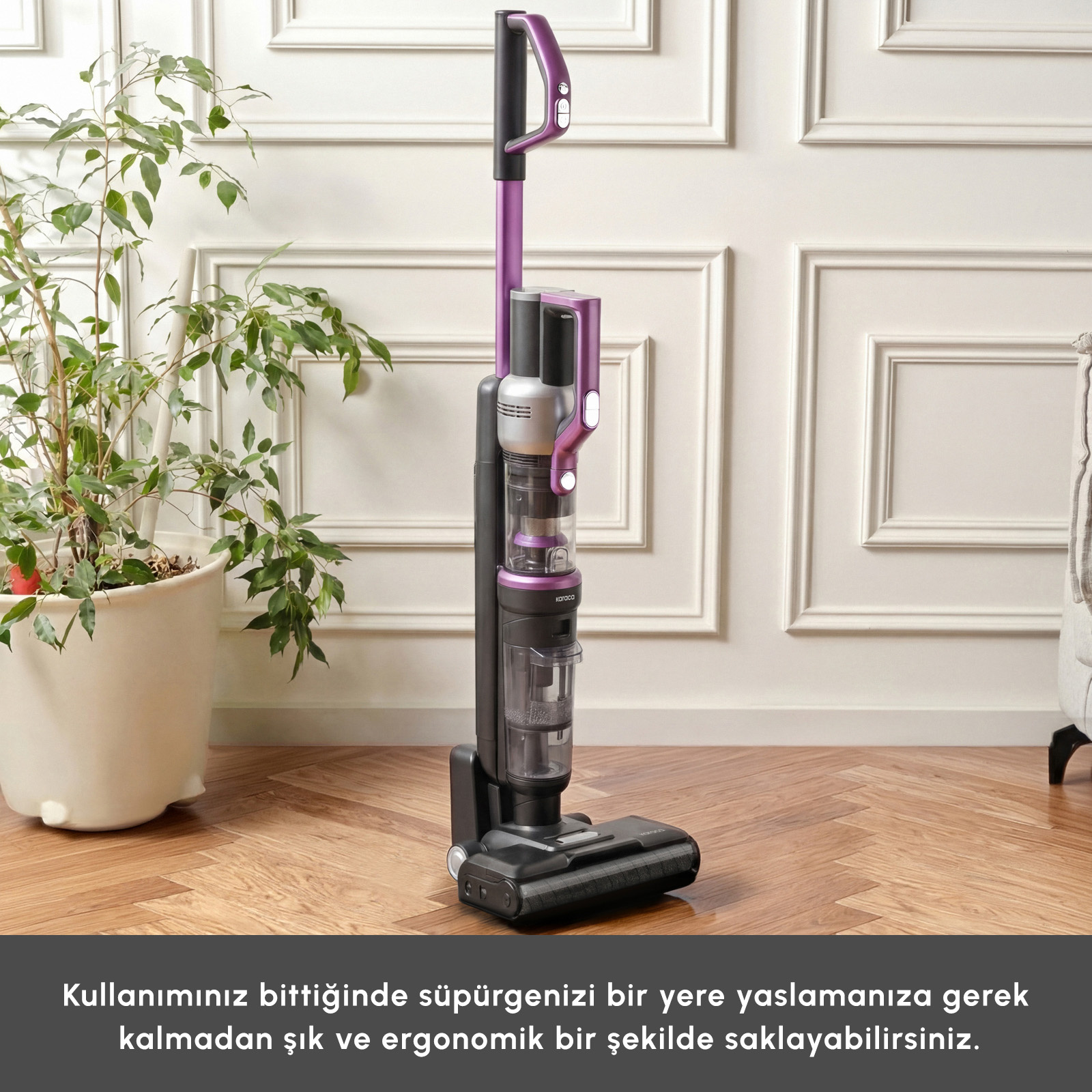 - Kullanımınız bittiğinde süpürgenizi bir yere yaslamanıza gerek kalmadan, kendi kendine dik durabilen özel tasarımı sayesinde şık ve ergonomik bir şekilde saklayabilirsiniz.
