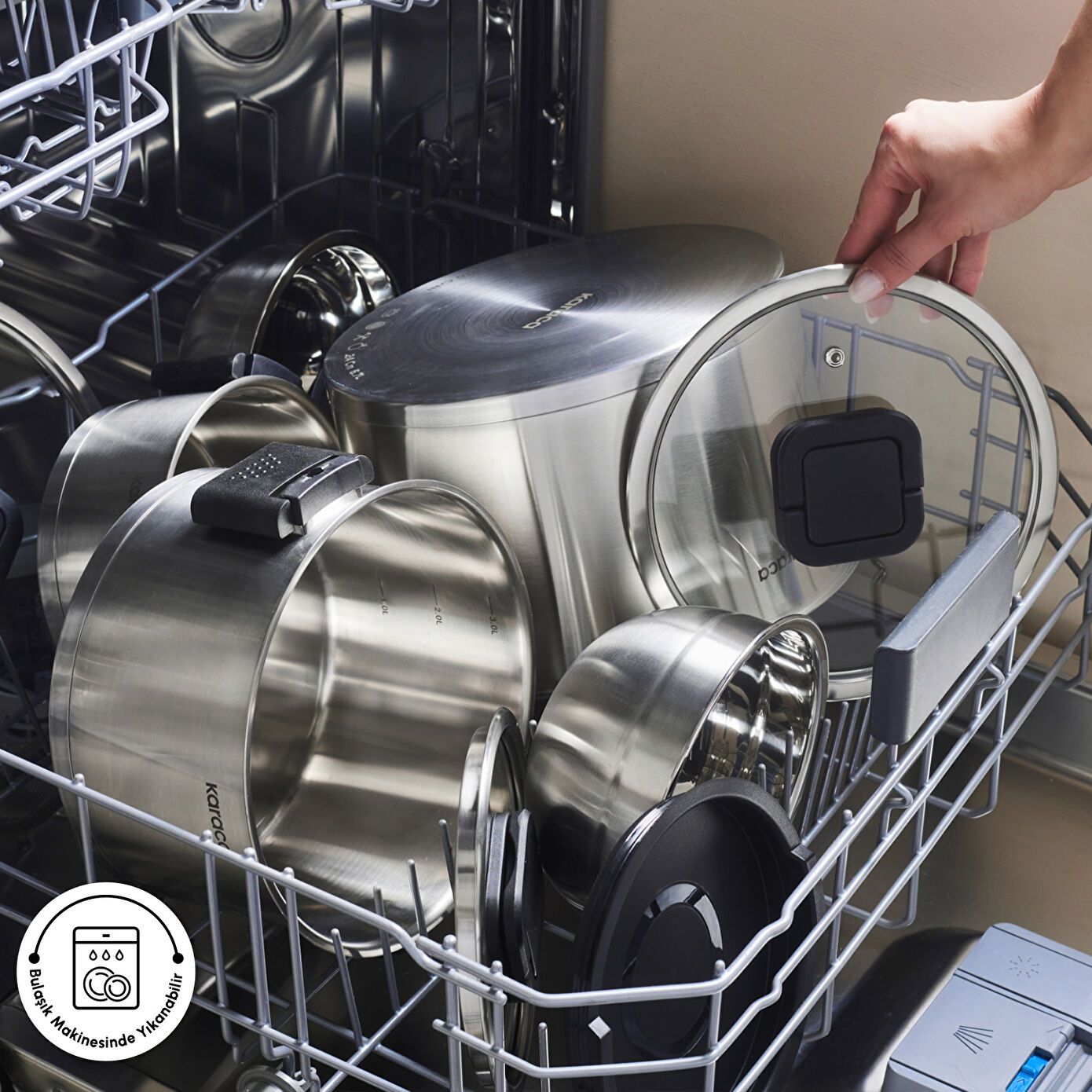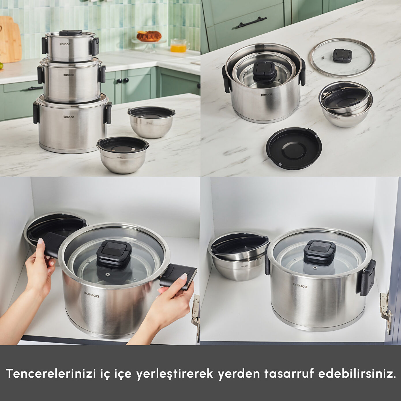 Katlanabilir kulpları sayesinde iç içe geçebilen ve mutfağınızda yer kaplamayan özel tasarım