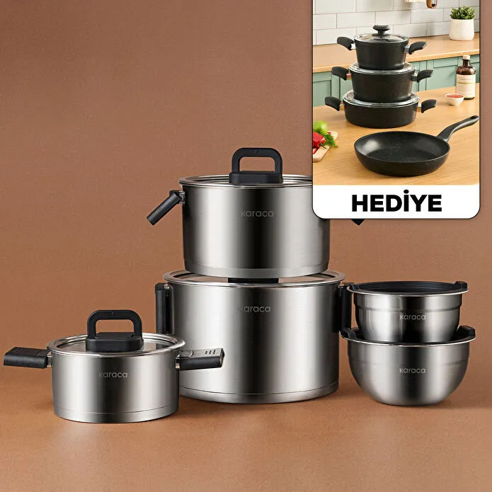 Mutfakta şıklığı, işlevselliği ve dayanıklılığı bir arada arayanlar için tasarlanan Karaca Aşiyan 10 Parça Çelik Tencere Seti, yemek pişirme deneyimini bir üst seviyeye taşıyor. Yüksek kaliteli 18/10 paslanmaz çelik yapısı, geniş parça içeriği ve çoklu ocak uyumluluğu ile her mutfağın olmazsa olmazı olmaya aday.