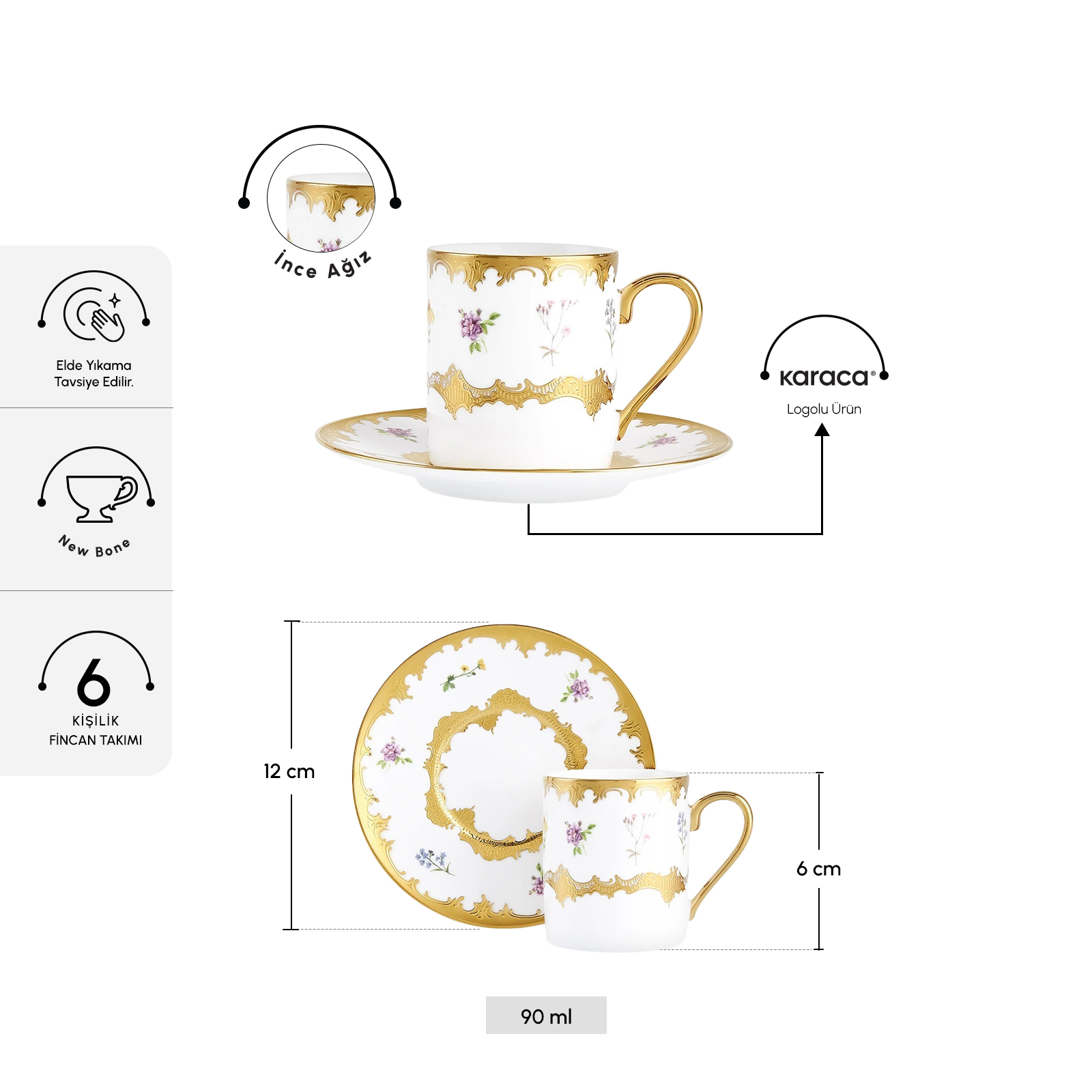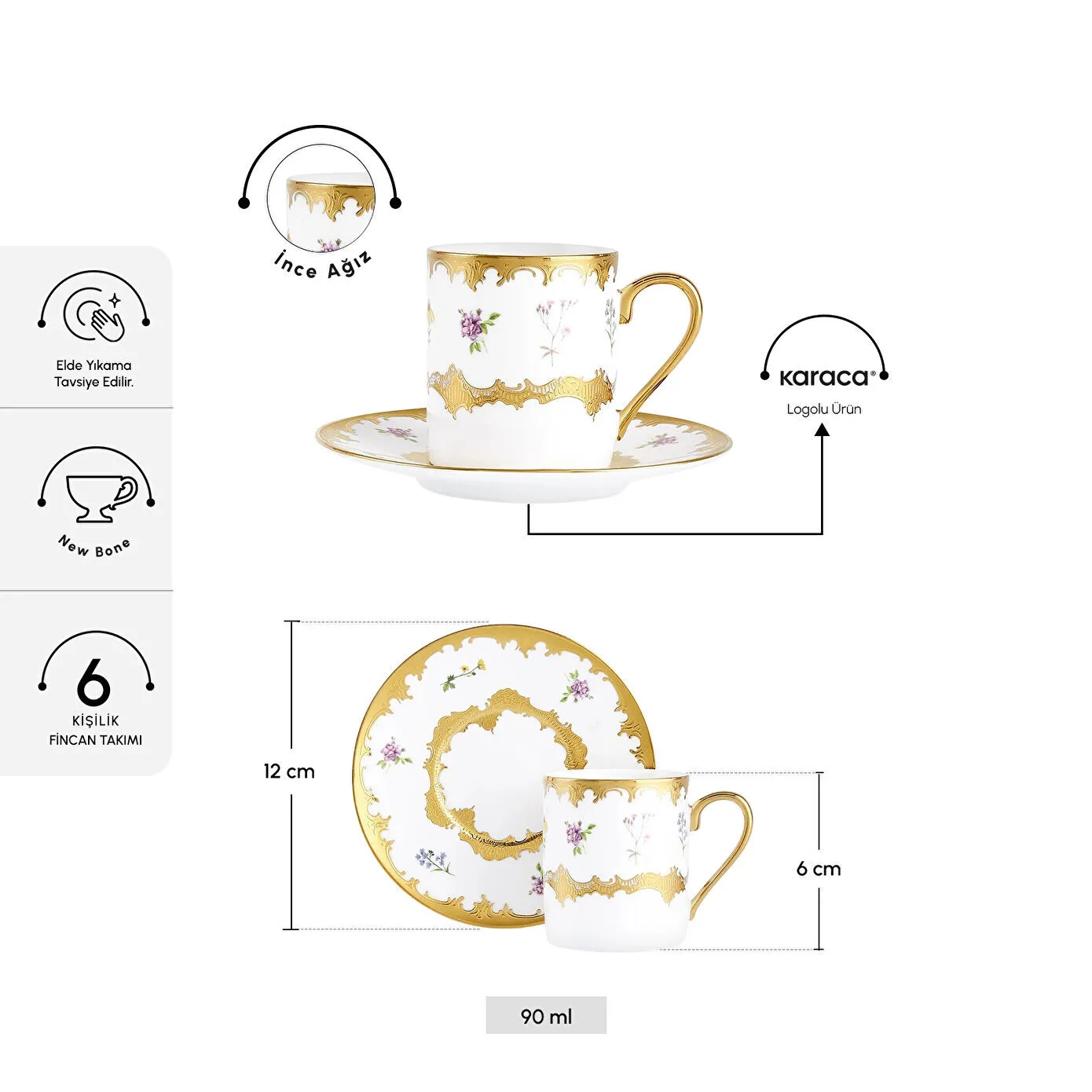 İdeal Hacim :90 ml kapasite, Türk kahvesi sunumları için mükemmel bir ölçüdür. Ergonomik kulplar sayesinde fincanlar rahat tutulur ve konforlu içim sağlar.