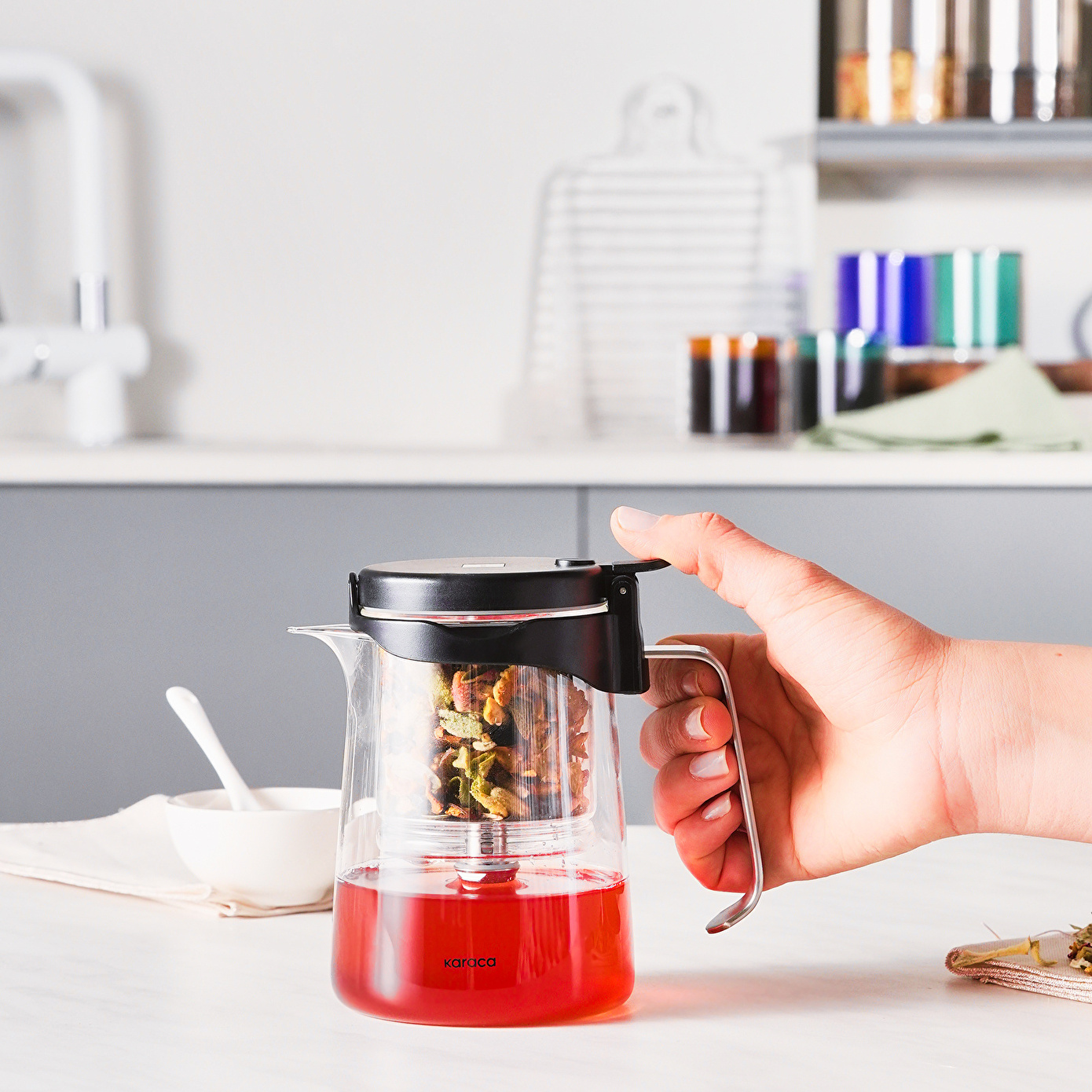 Karaca Brewy Tea Borosilikat Cam 550 Ml French Press,bitki çayı tutkunlarının çok seveceği pratik ve işlevsel bir kullanım sunar.Sürahinin içerisinde bulunan demleme kapsülü sayesinde bitki çayınız kapsül içerisinde demlenir ve su ile temas etmediği için acılaşmaz.Böylelikle her fincanda taze bir bitki çayının tadını çıkarabilirsiniz.Üstelik kapak üzerindeki düğmeye basarak iç haznedeki damlalığı açabilir,dem ayarını damak tadınıza göre ayarlayabilirsiniz.Modern tasarımı ile oldukça şık bir görünüme sahip Brewy Tea French Press'in sürahisi ısıya dayanıklı borosilikat camdan,mıknatıs sistemi ise paslanmaz çelikten oluşmaktadır.Bu sayede hem sağlığınız için güvenli hem de dayanıklılığı ile uzun ömürlüdür.