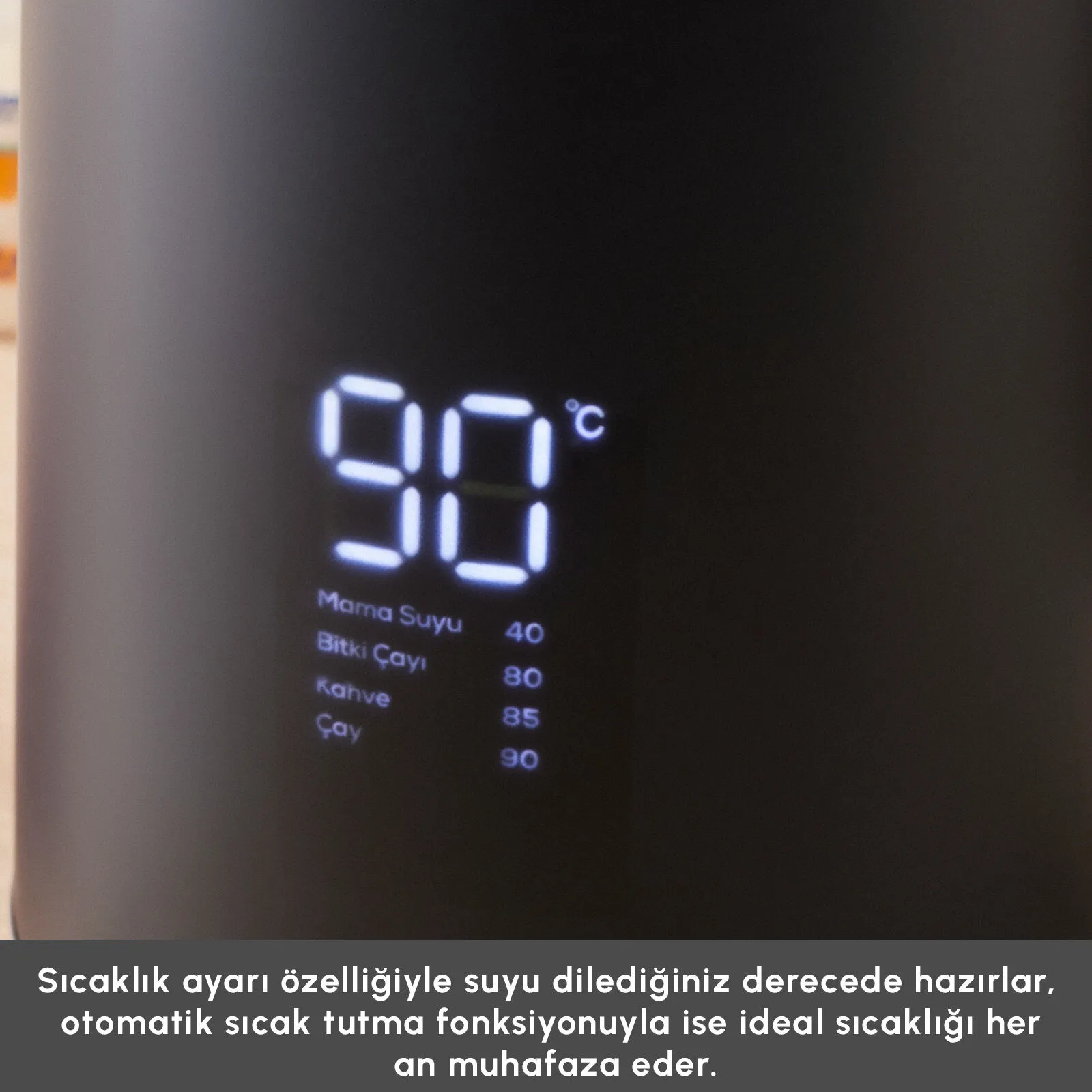 Su ısıtıcısın gövdesi üzerinde bulunan led ekranı ve kulpta bulunan tuşları sayesinde çay makinenizi kontrol edebilir, anlık su derecesini görüntüleyebilirsiniz.