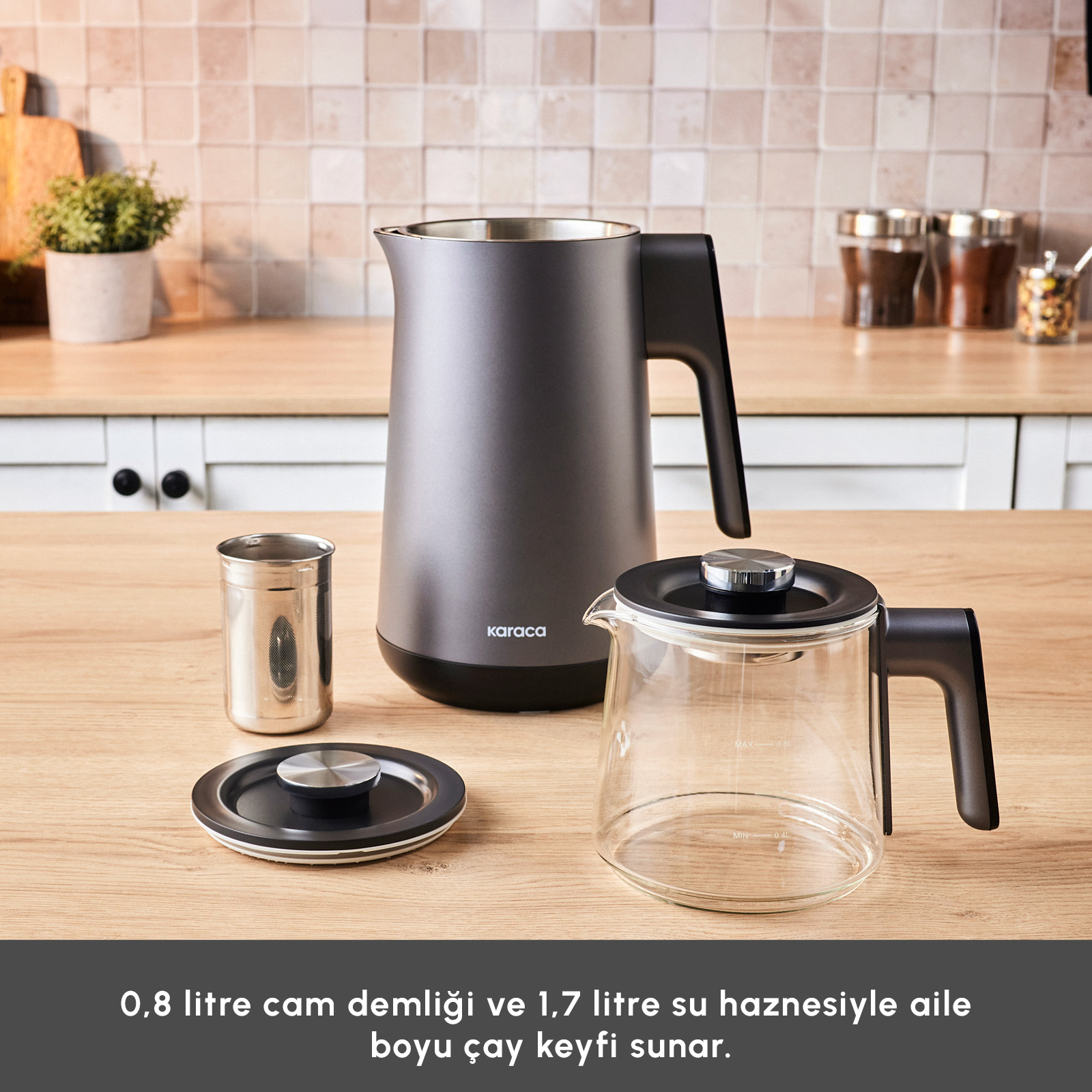 0,8 litre kapasiteli cam demliği ve 1,7 litre kapasiteli paslanmaz çelik su haznesi sayesinde aileniz ve misafirlerinizle çayın keyfine varabilirsiniz.