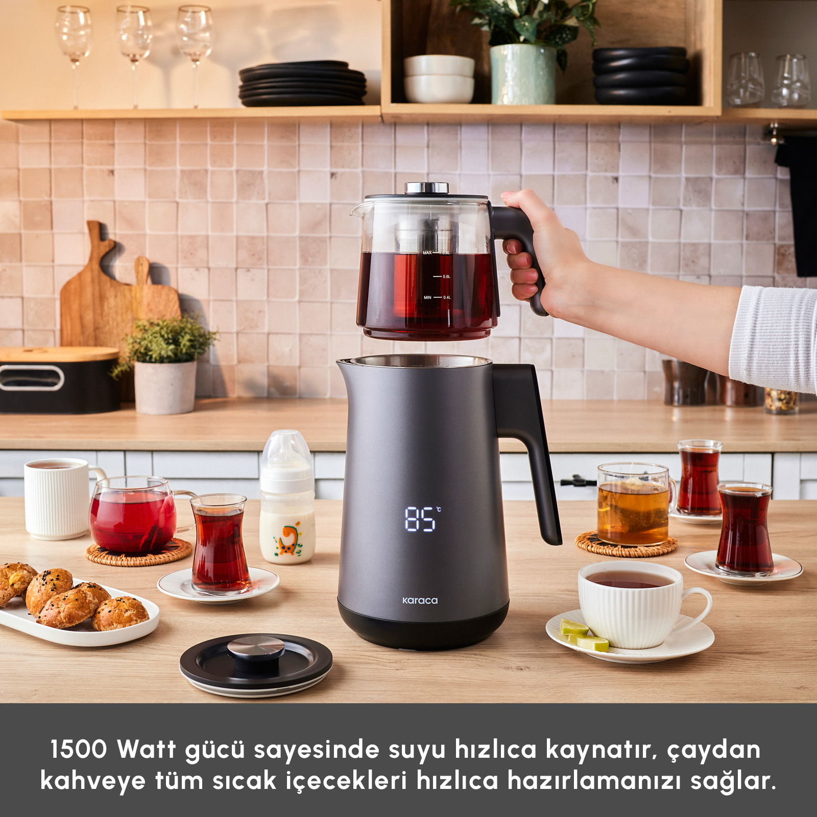 Karaca Cool Touch 1502 ile 40-80-85-90 ve 100 ℃ derece arasında sıcaklık kontrolü yapabilir, bu sayede farklı bitki çayı ya da kahve tarifleri için ideal sıcaklıkta su ısıtabilirsiniz.