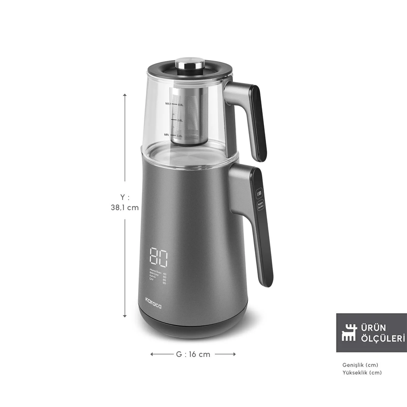 Su ısıtıcısın gövdesi üzerinde bulunan led ekranı ve kulpta bulunan tuşları sayesinde çay makinenizi kontrol edebilir, anlık su derecesini görüntüleyebilirsiniz.