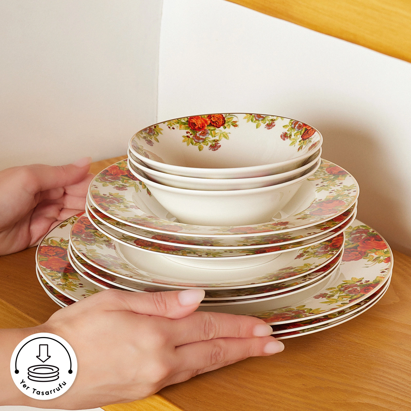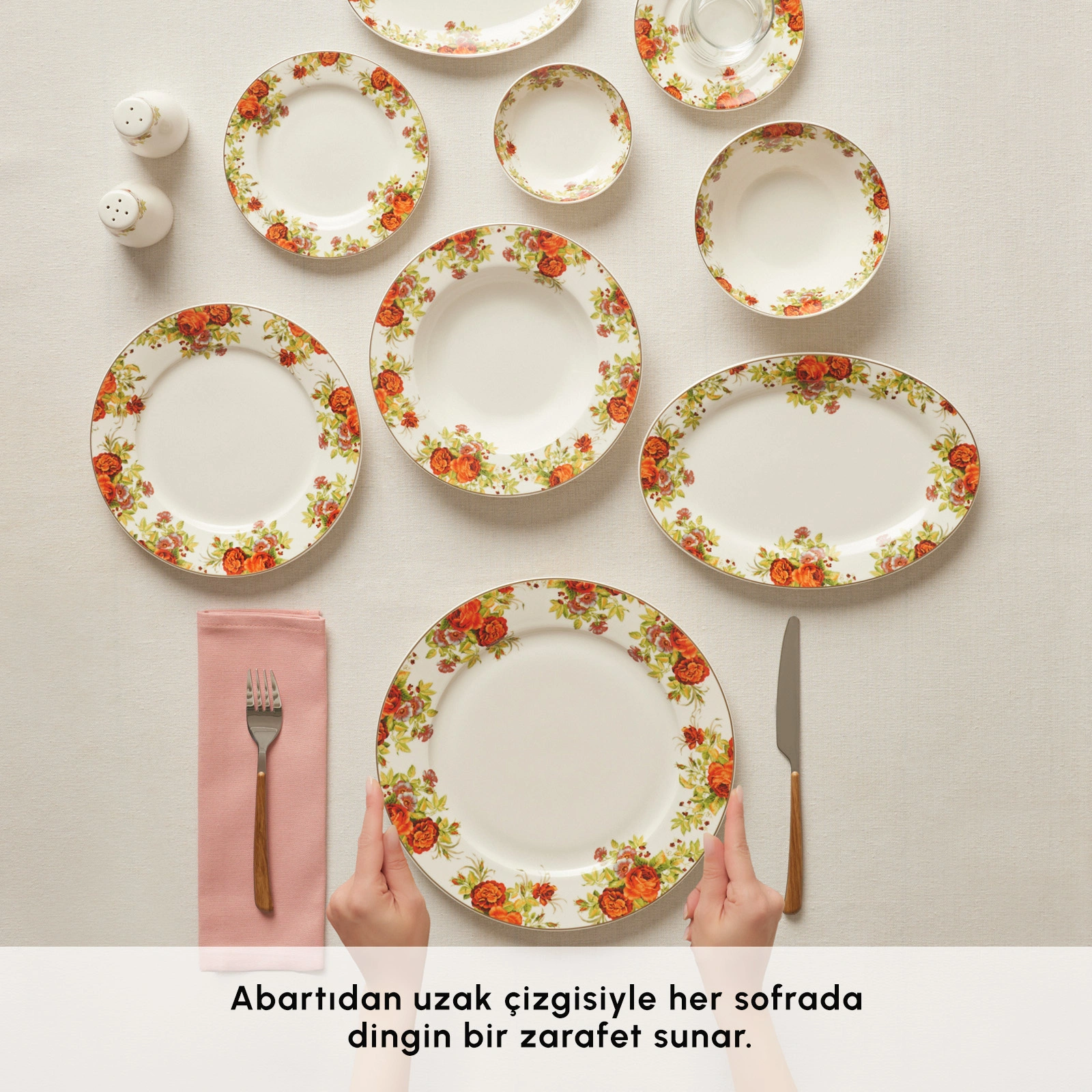 Kemik tozu içeren porselen yapısı sayesinde son derece hafif, aynı zamanda uzun ömürlü ve dayanıklıdır. Hem günlük kullanıma hem de özel davet sofralarına uyum sağlayan bu seri, zarif tasarımı kadar pratikliğiyle de fark yaratır.