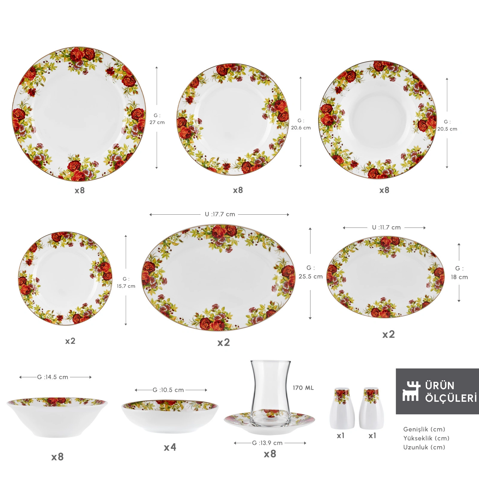 - 8 Adet Servis Tabak 27x2 cm (Genişlik x Yükseklik)