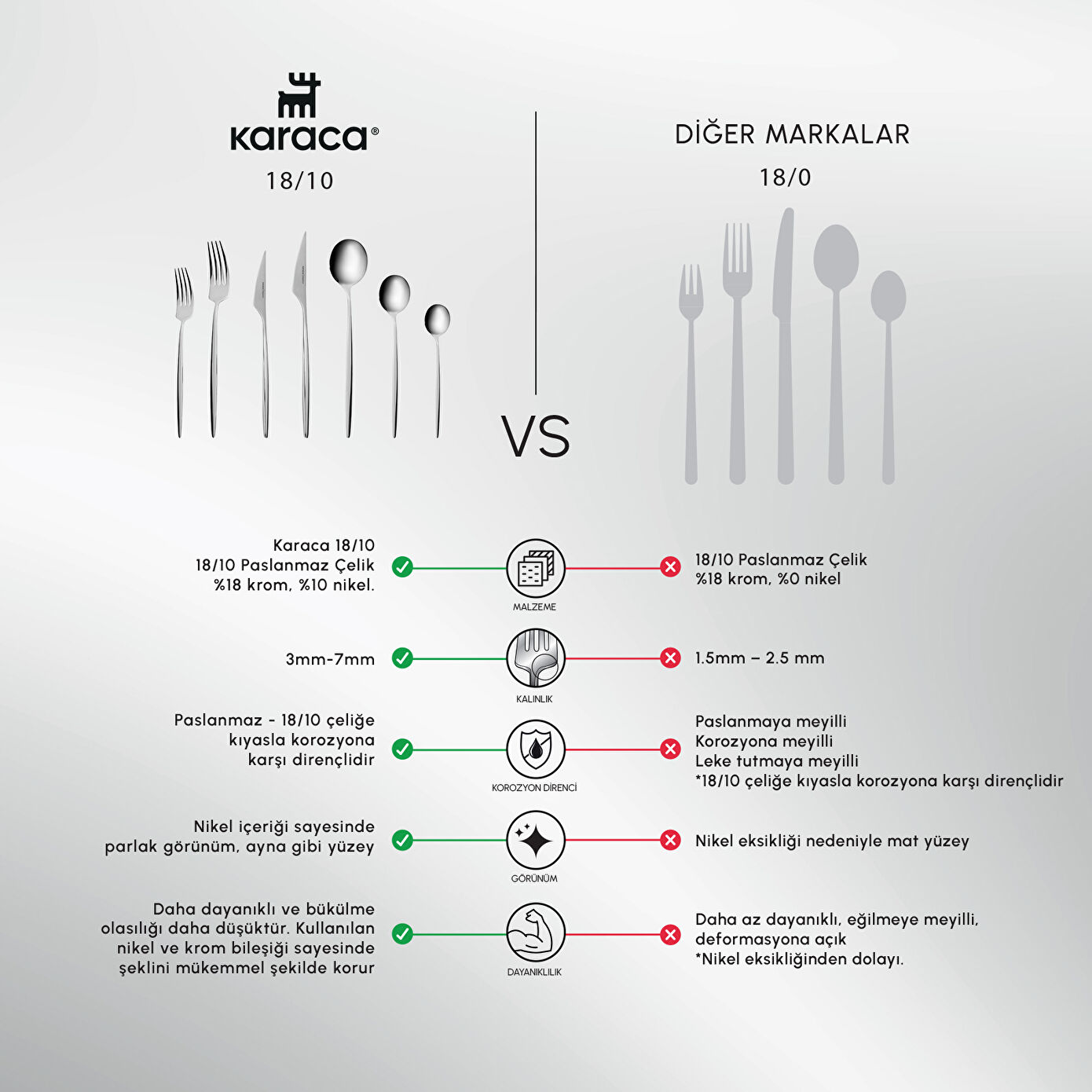 %18 krom ve %10 nikel içeren 18/10 paslanmaz çelik yapısı sayesinde hem uzun ömürlü hem de parlak görünümünü ilk günkü gibi korur, çok daha dayanıklı ve korozyona karşı dirençlidir.