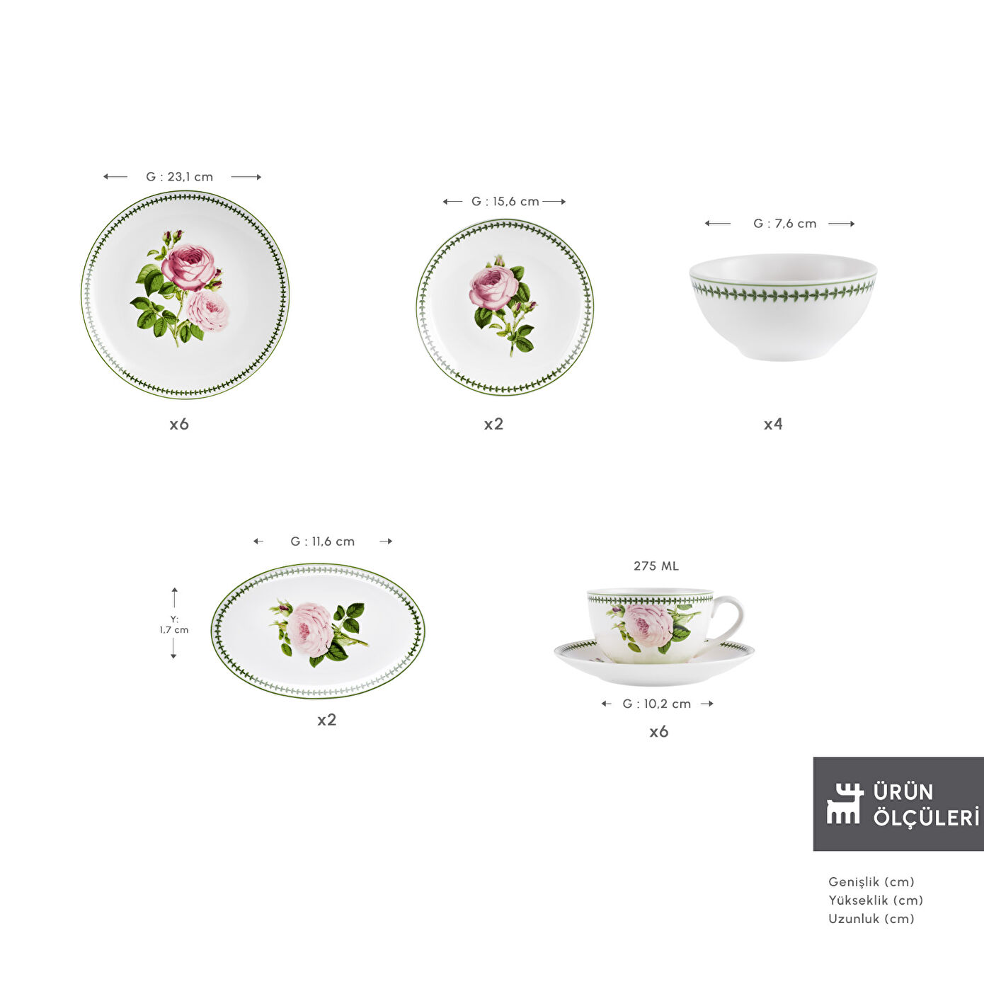 - 6 adet pasta tabak : 23.1 x 23.1 x 2.5 cm (Uzunluk x Genişlik x Yükseklik)